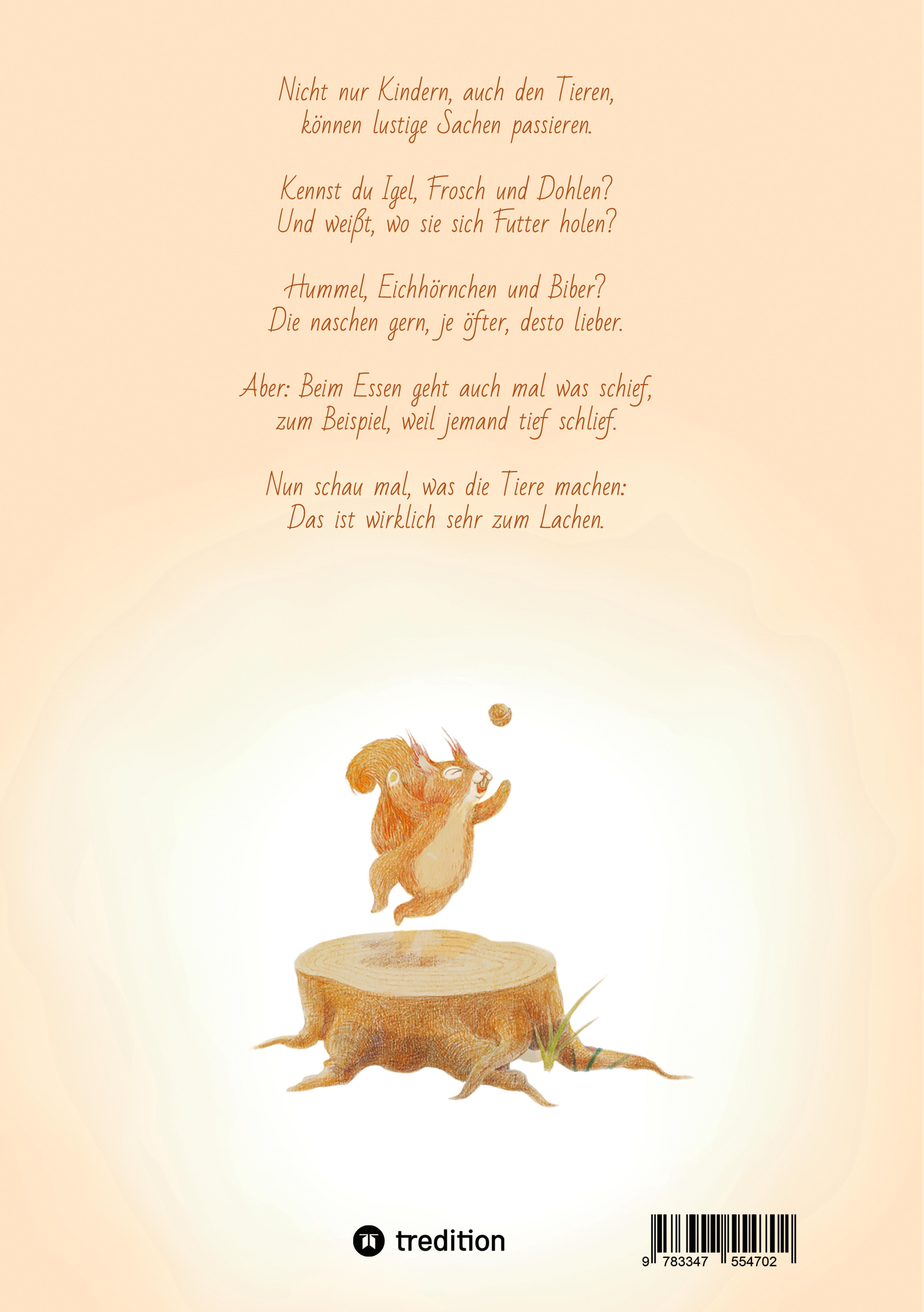 Ein Kinderbuch mit 12 heimischen Tierarten aus Park und Garten; den Tieren passiert so manches lustige Missgeschick bei derNahrungssuche. Jedes Bild ist mit einem 4-zeiligen Reim versehen.
