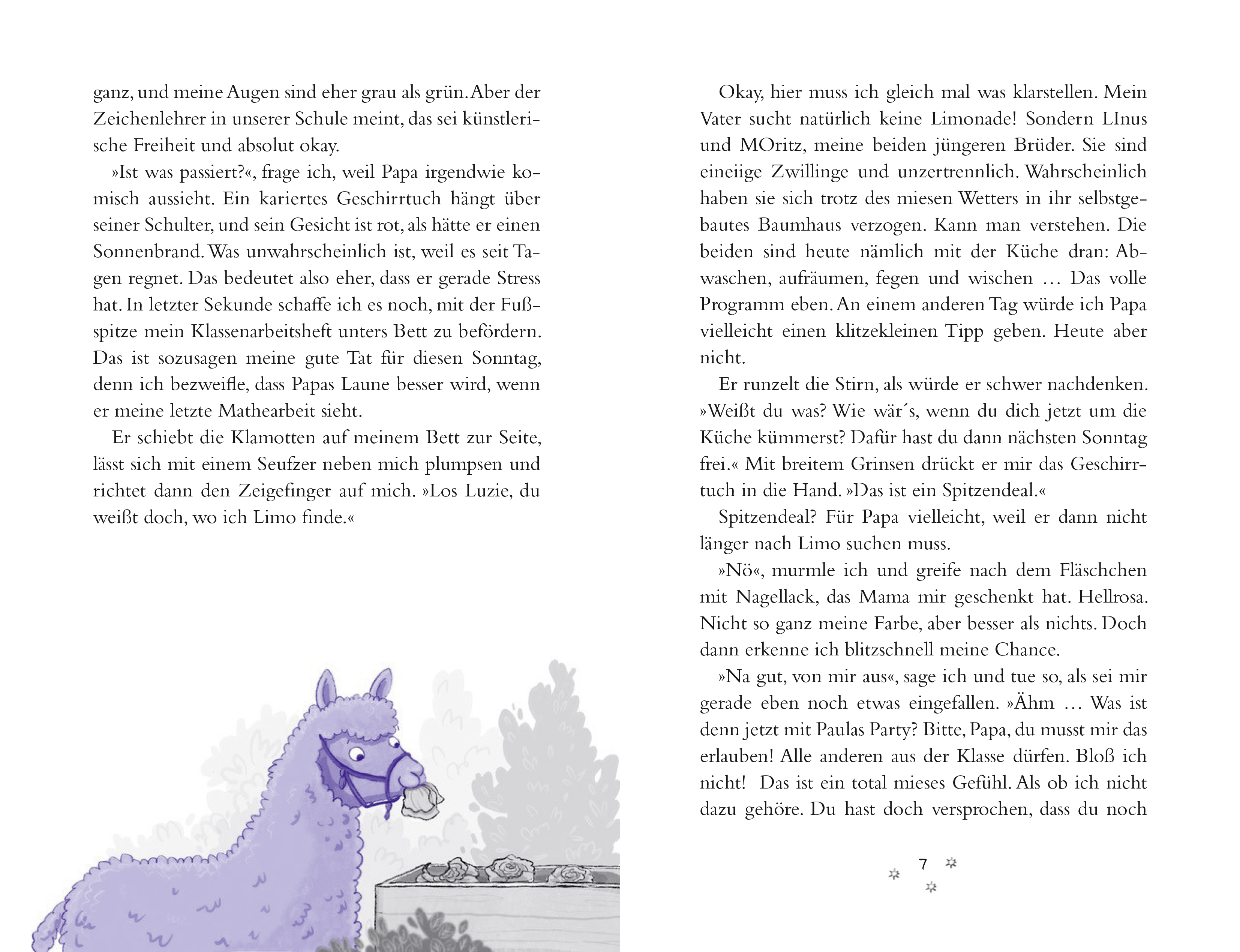 Bei einem Museumsbesuch entdeckt Luzie ein sonderbares Buch. Schnell stellt sie fest, dass alles, was sie dem Buch an Wünschen anvertraut, wahr wird! Luzie ist begeistert, jetzt schreibt sie sich die Welt, wie sie ihr gefällt. Doch dabei geht natürlich so einiges schief. Plötzlich steht ein dreibeiniges Lama im Garten und statt der sehnlich erwarteten Partyeinladung flattert eine Einladung zum Zahnarztbesuch ins Haus. Bis Luzie herausgefunden hat, wie das mit dem Wünschen am besten klappt, ist das Buch auch schon fast zu Ende. Ihre schöne neue Welt gerät ins Wanken. Doch zum Glück stellt sie fest, dass sich manche Wünsche ganz ohne Magie erfüllen ...