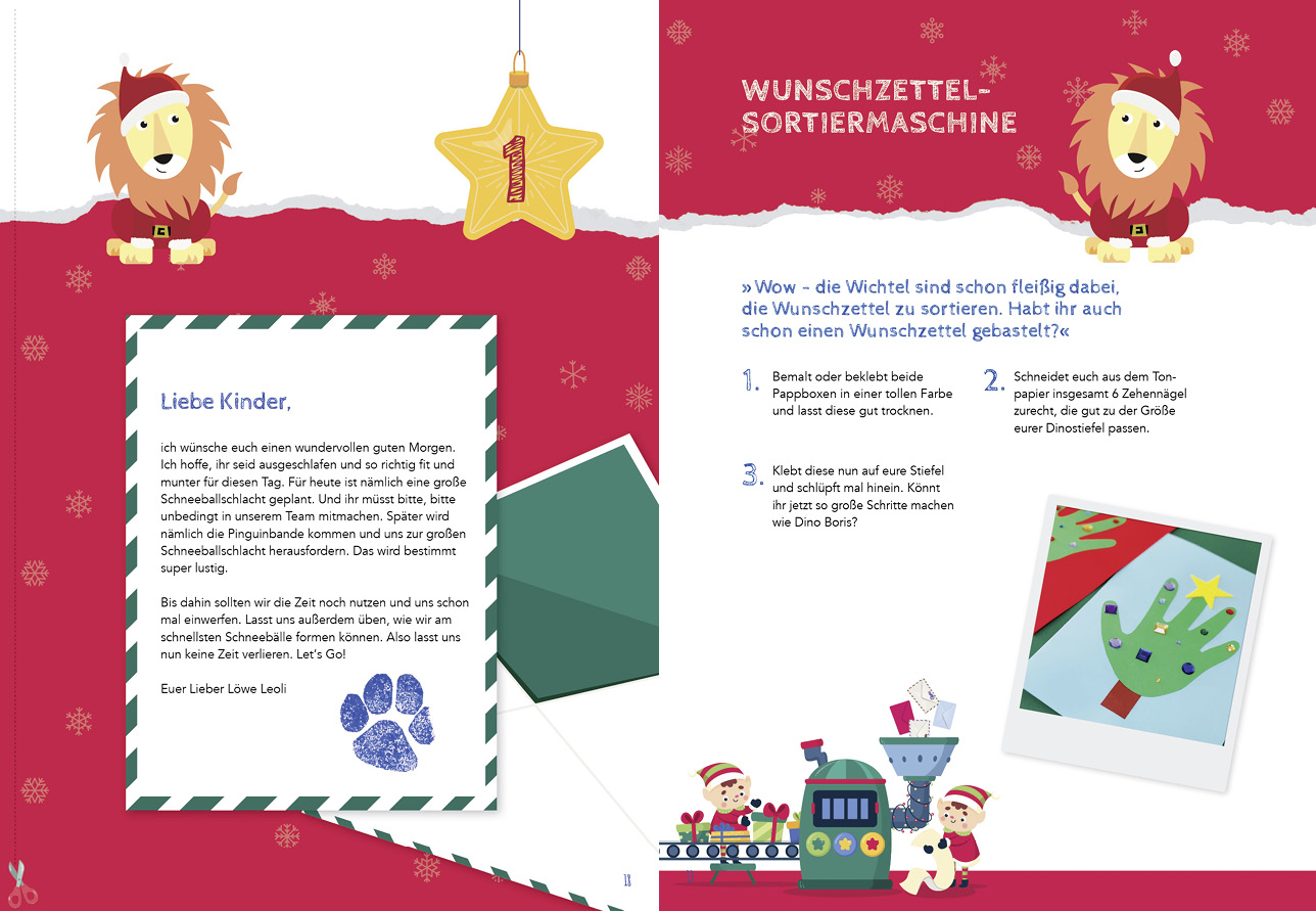 Türchen auf - der Advent ist da! Und was eignet sich besser, um die Vorfreude der Kinder auf Weihnachten so richtig anzuregen, als gemeinsames Vorlesen, Basteln und Spielen? Wir begleiten den Löwen Leoli auf seiner Mission, den Weihnachtswichteln in ihrer Werkstatt zu helfen. Da gibt es bis zum Heiligabend jede Menge zu tun und zum Glück hat Löwe Leoli allerlei Ideen. 24 Briefe mit weihnachtlichen Aktivitäten zum Basteln, Erzählen, Ausprobieren und Rätseln machen jeden Tag im Advent zu einem kreativen Abenteuer.