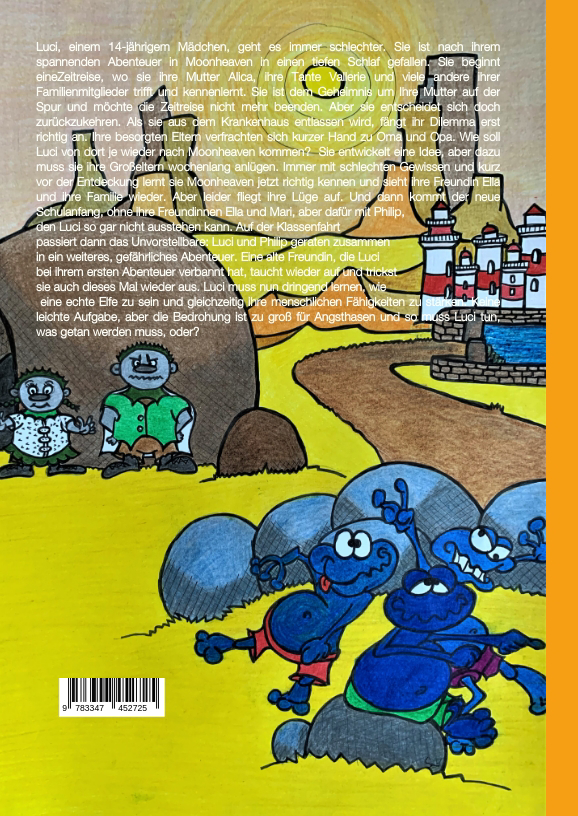 Luci, einem 14-jährigem Mädchen, geht es immer schlechter. Sie ist nach ihrem spannenden Abenteuer in Moonheaven in einen tiefen Schlaf gefallen. Sie beginnt eine Zeitreise, wo sie ihre Mutter Alica, ihre Tante Vallerie und viele andere ihrer Familienmitglieder trifft und kennenlernt. Sie ist dem Geheimnis um Ihre Mutter auf der Spur und möchte die Zeitreise nicht mehr beenden. Aber sie entscheidet sich doch zurückzukehren. Als sie aus dem Krankenhaus entlassen wird, fängt ihr Dilemma erst richtig an. Ihre besorgten Eltern verfrachten sich kurzer Hand zu Oma und Opa. Wie soll Luci von dort je wieder nach Moonheaven kommen? Sie entwickelt eine Idee, aber dazu muss sie ihre Großeltern wochenlang anlügen. Immer mit schlechten Gewissen und kurz vor der Entdeckung, lernt sie Moonheaven jetzt richtig kennen und sieht ihre Freundin Ella und ihre Familie wieder. Aber leider fliegt ihre Lüge auf. Und dann kommt der neue Schulanfang, ohne ihre Freundinnen Ella und Mari, aber dafür mit Philip, den Luci so gar nicht ausstehen kann. Auf der Klassenfahrt passiert dann das Unvorstellbare: Luci und Philip geraten zusammen in ein weiteres, gefährliches Abenteuer. Eine alte Freundin, die Luci bei ihrem ersten Abenteuer verbannt hat, taucht wieder auf und trickst sie auch dieses Mal wieder aus. Luci muss nun dringend lernen, wie eine echte Elfe zu sein und gleichzeitig ihre menschlichen Fähigkeiten zu stärken. Keine leichte Aufgabe, aber die Bedrohung ist zu groß für Angsthasen und so muss Luci tun, was getan werden muss, oder?