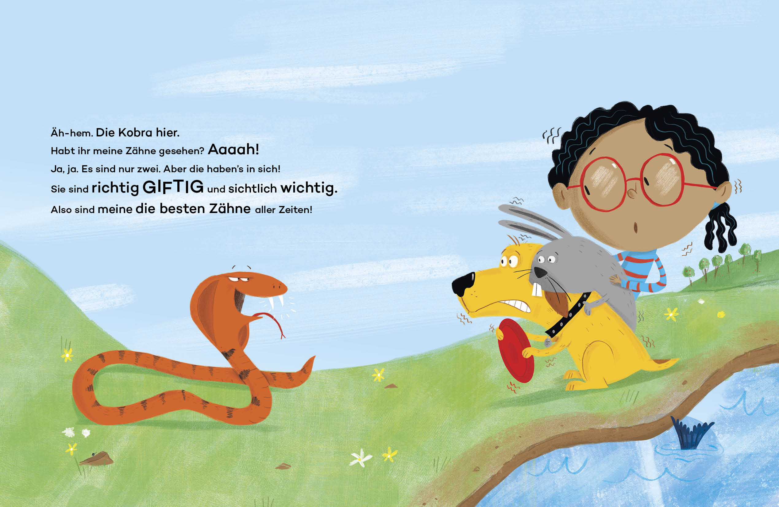 Ein lustiger „Wettkampf der Zähne“ beginnt und endet sehr überraschend, als sich ein kleiner flinker Gast, die Mücke, dazugesellt, die jeden beißen kann und fast nicht zu schnappen ist!