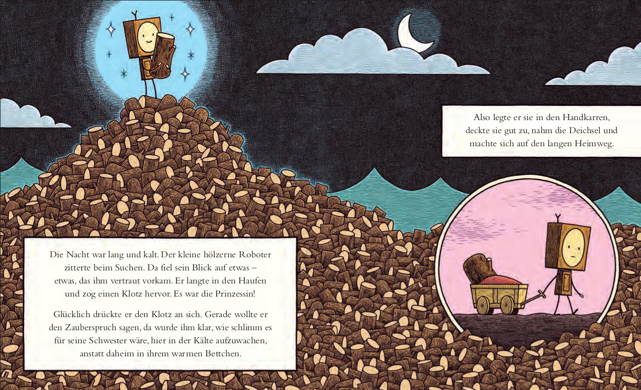 Die größte Sehnsucht des Königspaars? Ein Kind! Ihr Wunsch geht in Form eines Holzroboters und einer verzauberten Prinzessin gleich doppelt in Erfüllung. So weit, so wunderbar - doch wie immer im Märchen gilt es eine Hürde zu überwinden: Die Prinzessin verwandelt sich allabendlich zurück in ein Stück Holz und muss am Morgen von ihrem Bruder per Zauberspruch geweckt werden. Leider vergisst er es ein einziges Mal - da landet sie auf einem Berg von Holzklötzen und wird per Schiff in den eisigen Norden verfrachtet. Der Holzroboter folgt seiner Schwester, um sie zu retten. Unzählige Abenteuer auf dem Rückweg sind zu bestehen, bis die Lage aussichtslos erscheint ... Doch mit Hilfe der Tiere des Waldes gelingt die glückliche Heimkehr!Tom Gauld erzählt und zeichnet eine märchenhafte Geschichte voller Geschwisterliebe und Abenteurertum, die derzeit in den USA, England und Frankreich mit Lob und Preis überhäuft wird.