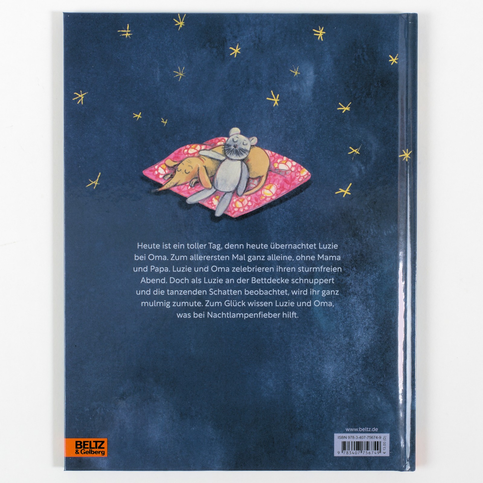 Heute ist ein toller Tag, denn heute übernachtet Luzie bei Oma. Zum allerersten Mal ganz alleine, ohne Mama und Papa. Luzie und Oma zelebrieren ihren sturmfreien Abend mit Schnittchen vorm Fernseher und Kindersekt aus geringelten Gläsern. Als Einschlafoma im Nachthemd sieht Oma ganz schön komisch aus, findet Luzie und kichert. Doch als Luzie an der Bettdecke schnuppert, die Schatten an der Wand beobachtet und den nächtlichen Geräuschen lauscht, wird ihr ganz mulmig zumute ... Zum Glück wissen Luzie und Oma, was bei Nachtlampenfieber hilft.