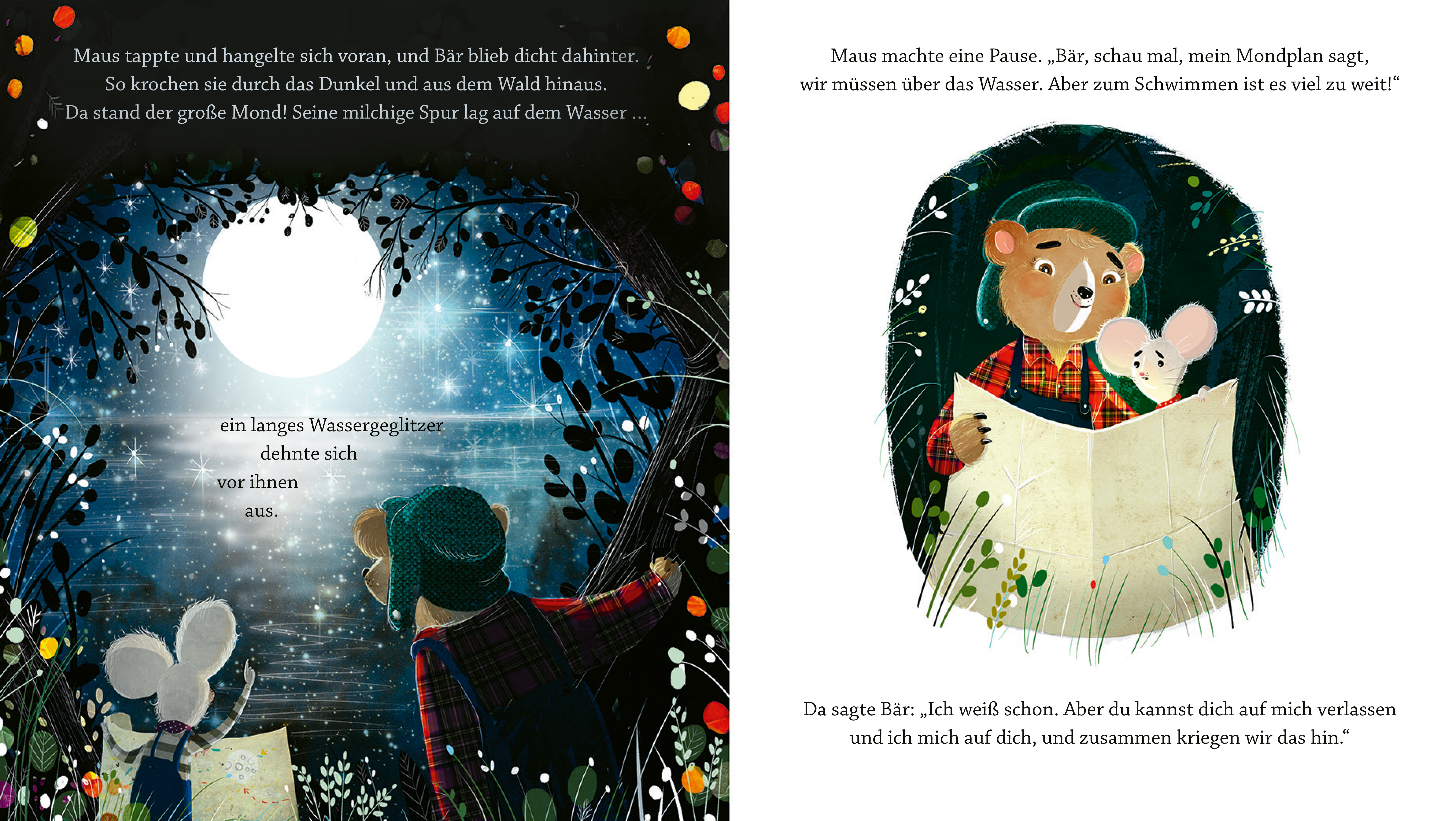 Maus hat einen großen Traum: Sie möchte zum Mond reisen – ganz allein! Die Hilfe des Bären braucht sie nicht, denn ihr Mondplan soll ihr den Weg weisen. Doch als sie sich im dunklen Wald verirrt, ist sie froh, dass der Bär auf einmal doch da ist. Gemeinsam setzen sie ihre Reise fort und erkennen: Zu zweit schafft man viel mehr als allein.