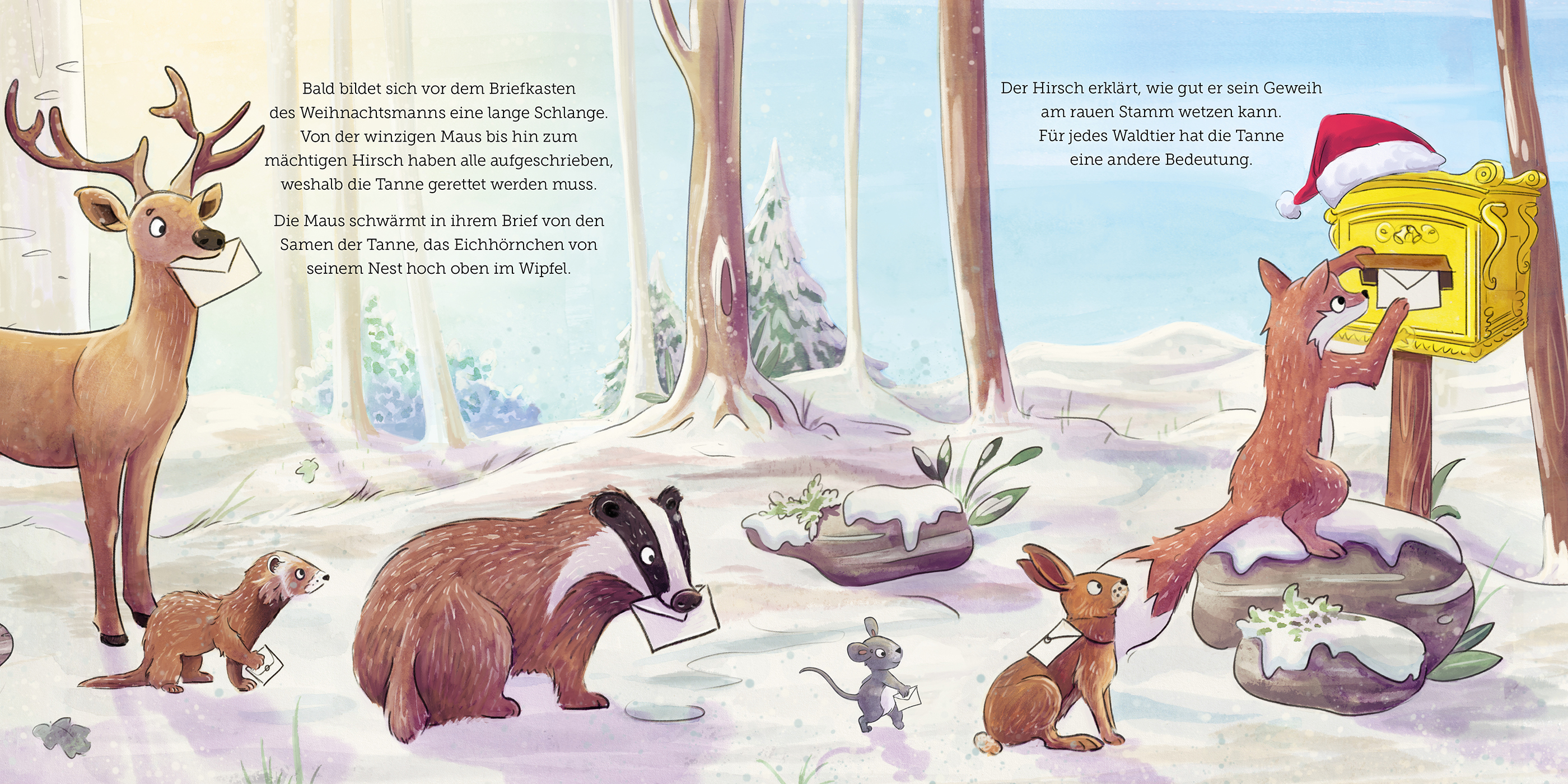 Große Aufregung bei den Waldtieren: Ihre alte Tanne soll zum Weihnachtsbaum werden! Dann würden sie ihr geliebtes Zuhause verlieren, und das darf nicht passieren. Jedes Tier schreibt einen Brief an den Weihnachtsmann, in dem es erklärt, warum die Tanne nicht gefällt werden darf. In letzter Minute greift dieser ein und zeigt den Tieren, wie sie ihr Zuhause mit viel Fantasie retten können. Gerade noch rechtzeitig, um das schönste Weihnachtsfest aller Zeiten zu feiern - Tiere und Menschen gemeinsam.