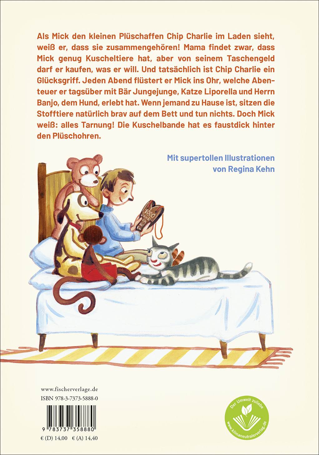 Als Mick den kleinen Plüschaffen Chip Charlie im Laden sieht, weiß er, dass sie zusammengehören! Mama findet zwar, dass Mick genug Kuscheltiere hat, aber von seinem Taschengeld darf er kaufen, was er will. Und wirklich: Chip Charlie ist ein Glücksgriff. Jeden Abend vor dem Einschlafen flüstert er Mick ins Ohr, welche Abenteuer er tagsüber mit Bär Jungejunge, Katze Liporella und Herrn Banjo, dem Hund, erlebt hat. Wenn jemand zu Hause ist, sitzen die Stofftiere natürlich brav auf dem Bett und tun nichts. Doch Mick weiß: Alles Tarnung! Die Kuschelbande hat es faustdick hinter den Plüschohren!