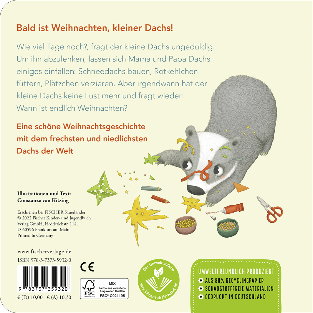 Wie viel Tage noch?, fragt der kleine Dachs ungeduldig. Um ihn abzulenken, lassen sich Mama und Papa Dachs einiges einfallen: Schneedachs bauen, Rotkehlchen füttern, Plätzchen verzieren ... aber irgendwann hat der kleine Dachs keine Lust mehr und fragt wieder: Wann ist endlich Weihnachten? Dann ist es endlich so weit! Und als der aufregende Abend dann endlich vorbei ist, flüstert der kleine Dachs beim Einschlafen - Und wann ist wieder Weihnachten?
