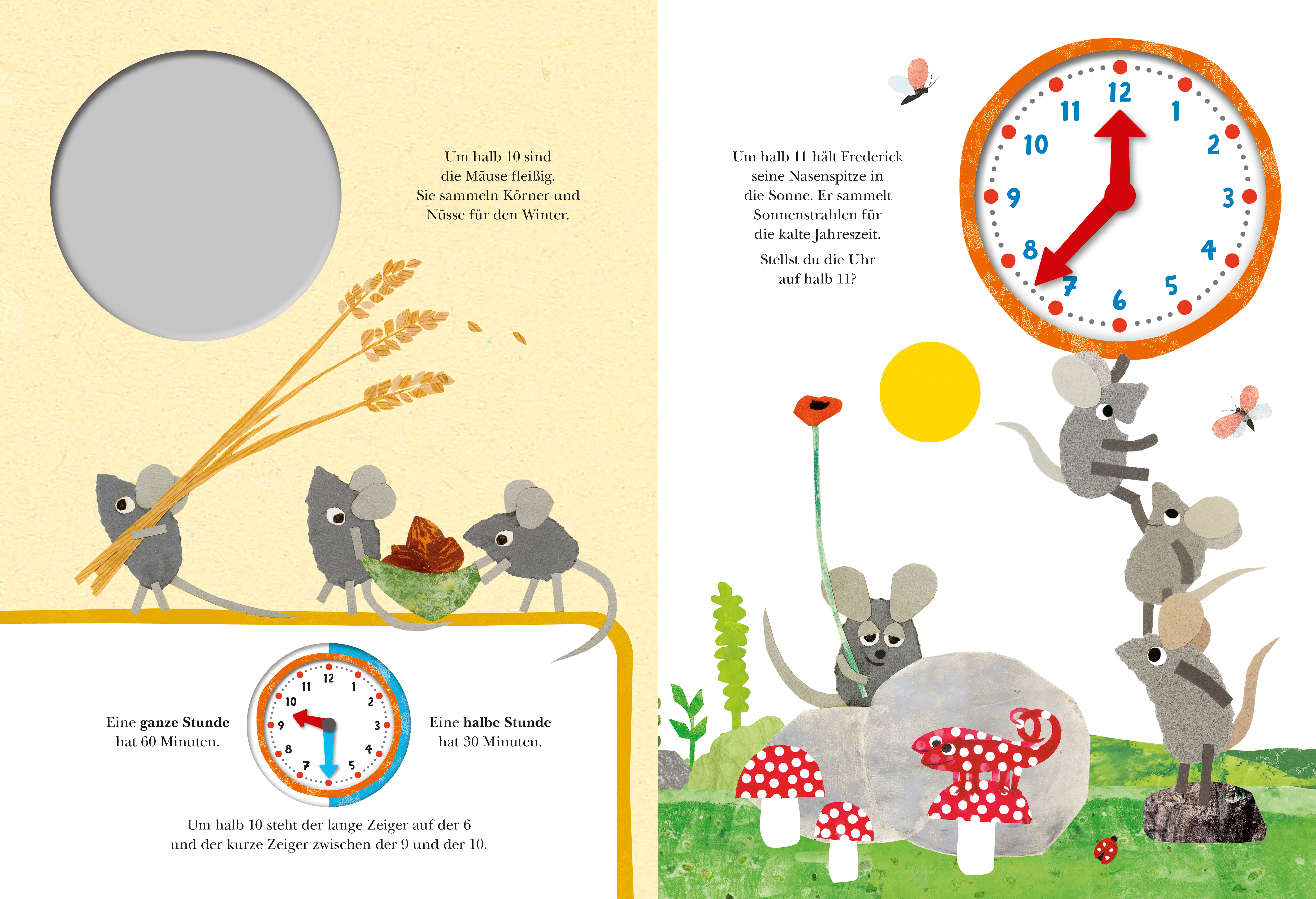 Mit Frederick und seinen Freunden ist von morgens bis abends immer etwas zu tun. Um acht Uhr gibt es Frühstuck, und um halb 11 hält Frederick seine Nasenspitze in die Sonne. Die Allerkleinsten begleiten die lustigen Tierchen im Verlauf eines Tages und entdecken dabei spielerisch die Uhrzeiten. Kinder ab 4 lernen den Tagesablauf kennen und werden dazu ermutigt, ihr neu erlerntes Wissen anzuwenden. Die verschiedenen Uhrzeiten können durch die beweglichen Zeiger selbstständig auf dem Ziffernblatt eingestellt werden.