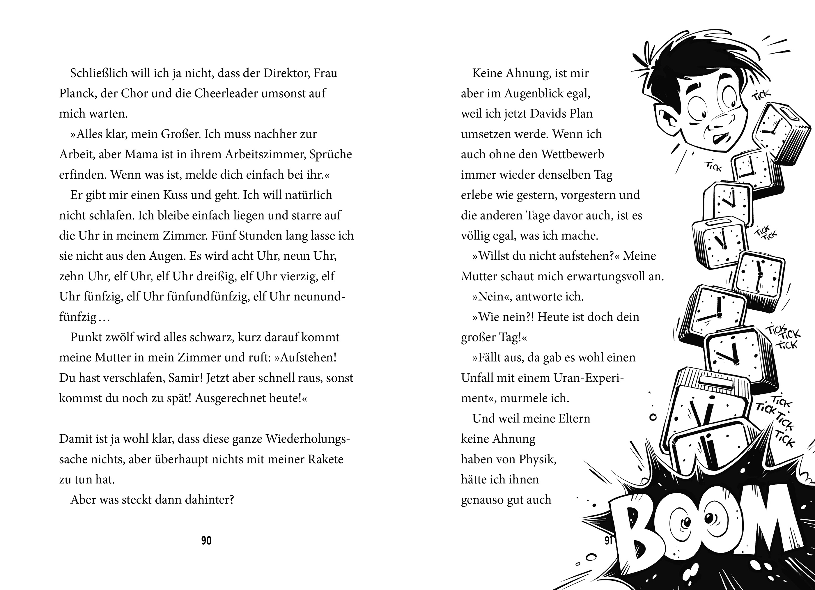 Samir ist ganz schön aufgeregt: die ganze Schule setzt große Hoffnung in seinen Sieg beim Physik-Wettbewerb. Leider geht sein Experiment spektakulär in die Hose. Doch dann bekommt er eine weitere Chance. Und noch eine. Und noch eine. Denn jeden Morgen erwacht Samir wieder am exakt gleichen Tag und hat die Möglichkeit, alle Karten neu zu mischen. Was sich anfangs wie ein Geschenk anfühlt, entpuppt sich aber schnell als Fluch, denn egal was Samir auch versucht, er kann die Zeitschleife nicht durchbrechen. Schon bald ist der Physik-Wettbewerb seine kleinste Sorge ...