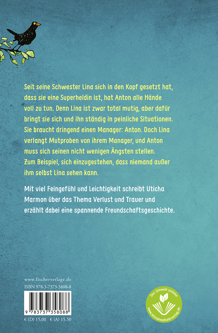Seit seine Schwester Lina sich in den Kopf gesetzt hat, dass sie eine Superheldin ist, hat Anton alle Hände voll zu tun. Denn Lina ist zwar total mutig, aber dafür bringt sie sich und ihn ständig in peinliche Situationen. Sie braucht dringend einen Manager: Anton. Doch Lina verlangt Mutproben von ihrem Manager, und Anton muss sich seinen nicht wenigen Ängsten stellen. Zum Beispiel, sich einzugestehen, dass niemand außer ihm selbst Lina sehen kann.