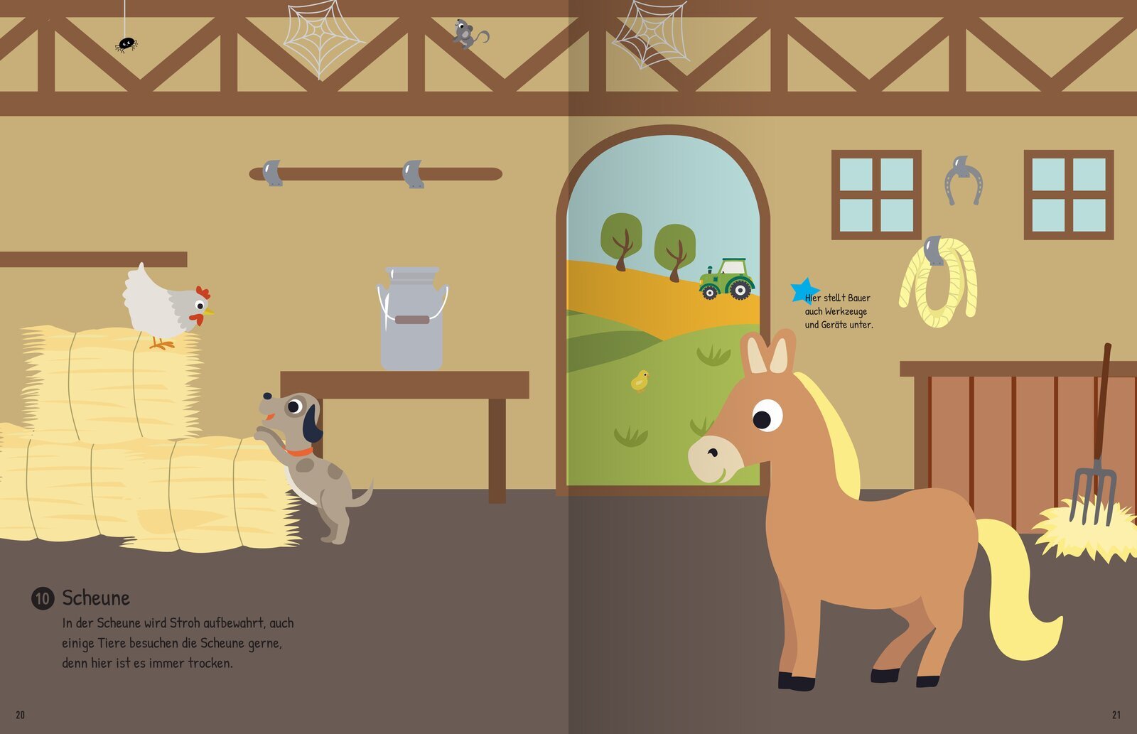 Auf dem Hof – Kühe auf der Weide – Federvieh – Schweine – Traktor auf dem Getreidefeld – Gemüsegarten – In der Küche – Am Ententeich – Auf der Pferdekoppel – Scheune – Der Hofladen - Rätsel