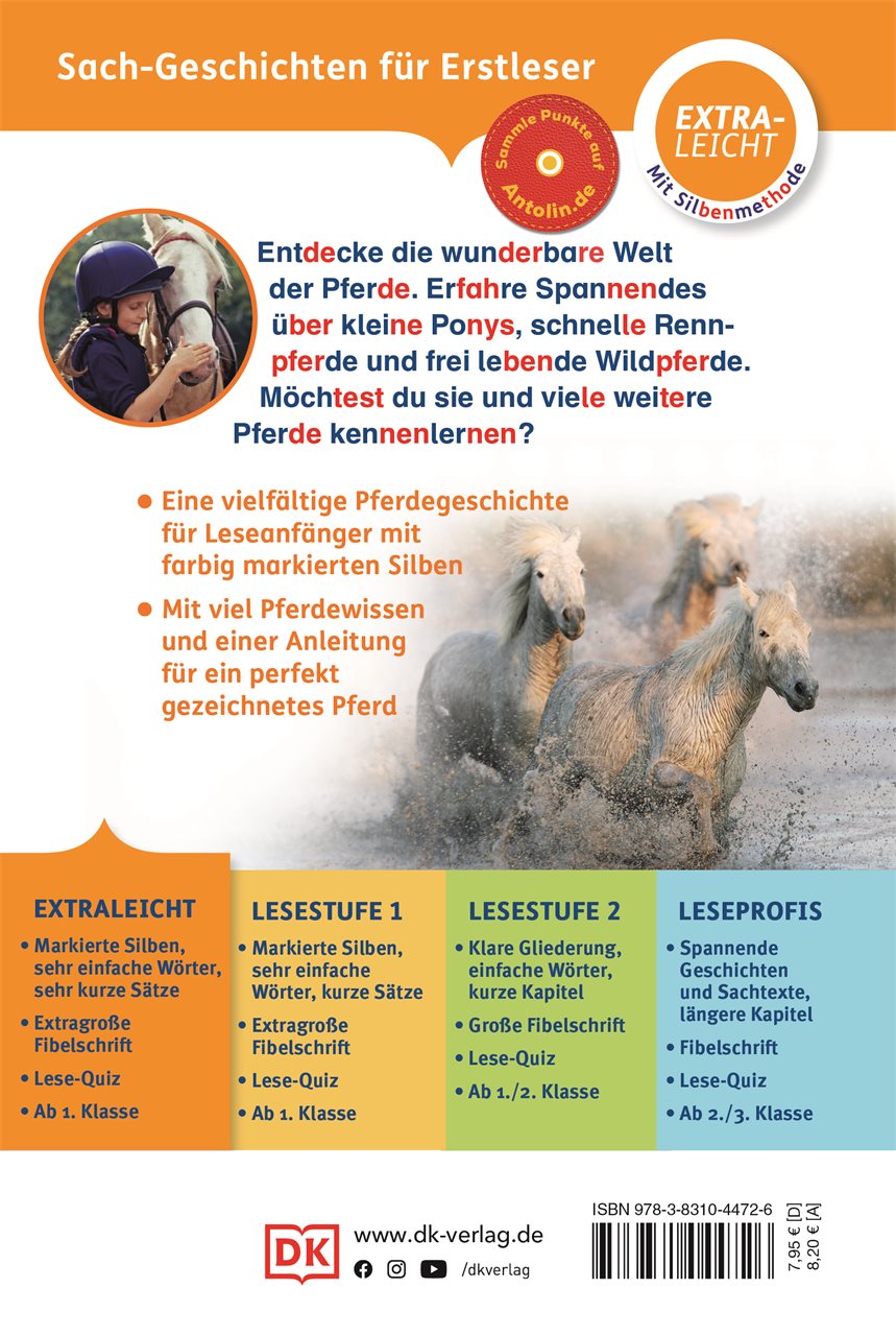 Dieses tierische Erstlesebuch für Kinder eignet sich mit kurzen Sätzen, einfacher Sprache und extra großer Fibelschrift perfekt zur Leseförderung. Farbig markierte Silben, ein praktisches Lesebändchen und ein übersichtliches Glossar zum Nachschlagen der Wörter erleichtern das Lesenlernen und mit dem Mix aus fesselnder Erzählung und spannendem Sachwissen zu Pferden, kreativen Extras und einem Quiz macht Lesen üben gleich dreimal so viel Spaß!