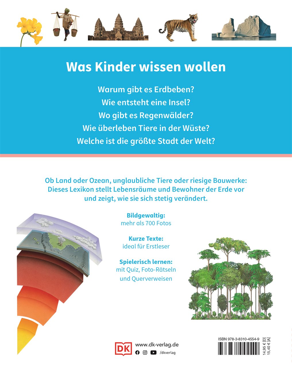 Von der Wüste bis zum Ozean, von den höchsten Bergen bis in tief versteckte Höhlen und von endlosen Weiten bis in belebte Städte: Auf unserem Planeten Erde gibt es einiges zu entdecken. Mit über 700 Fotos vermittelt dieses Lexikon seitenweise Sachwissen für Kinder zum bunten Leben auf der Erde. In kurzen Texten erfahren Kinder ab 6 Jahren, wie Erdbeben entstehen, wo auf der Welt die Wälder wachsen und was der Klimawandel für Menschen und Tiere bedeutet.