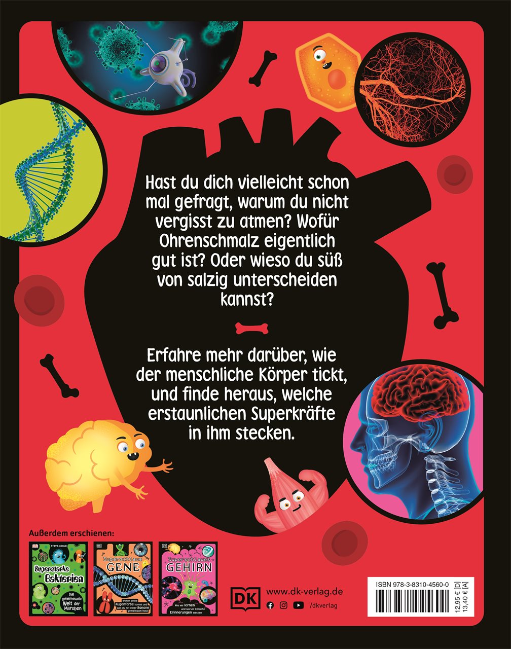 Laufen, springen, tanzen, rennen oder mal nur platt rumliegen unser Körper ist immer im Einsatz. Aber was passiert eigentlich unter unserer Haut, während wir durch den Alltag gehen? Dieses Sachbuch liefert Kindern ab 7 Jahren altersgerechtes Wissen zum menschlichen Körper und ist voll mit faszinierenden Fakten zu Organen, DNA, Muskeln, Medizin und Co. Comic-Figuren in Form von Viren, Zellen und Bakterien führen durchs Buch und machen mit Grafiken und Fotos aus diesem komplexen Thema eine anschauliche Entdeckungstour.