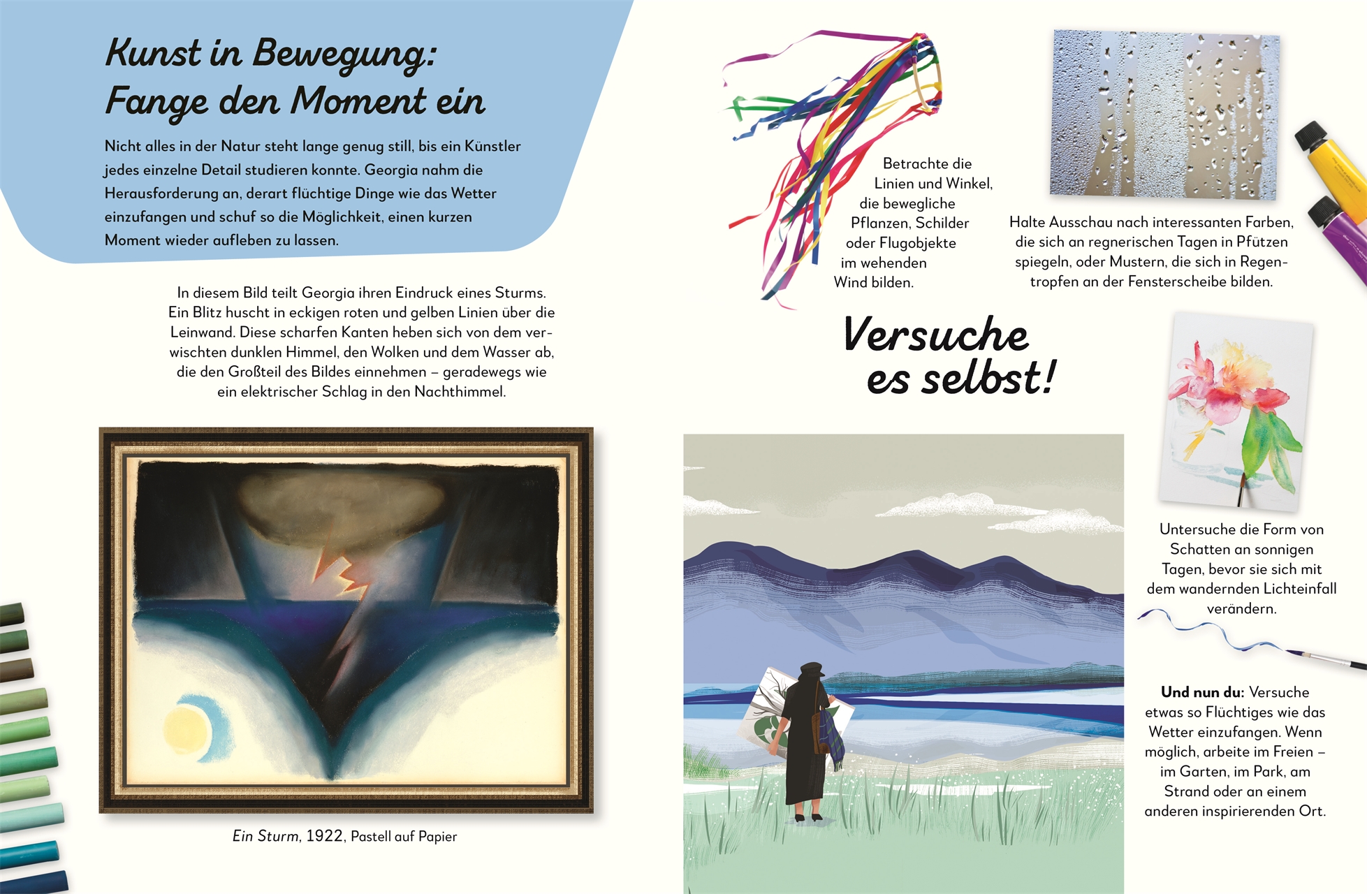 Strahlende Blumen und die Farben der Wüste: Die Malerei von Georgia O'Keeffe ist weltberühmt. Wie lebte die große Künstlerin? Woher nahm sie ihre Inspiration und wie sah ihre Technik aus? Mit dieser eindrucksvoll illustrierten Biografie halten Kinder seitenweise spannende Kunstgeschichte in den Händen. Dabei tauchen sie nicht nur in das Leben der inspirierenden Künstlerin ein, sondern erhalten auch viele praktische Anregungen, den einzigartigen Stil von Georgia O Keeffe selbst auszuprobieren.