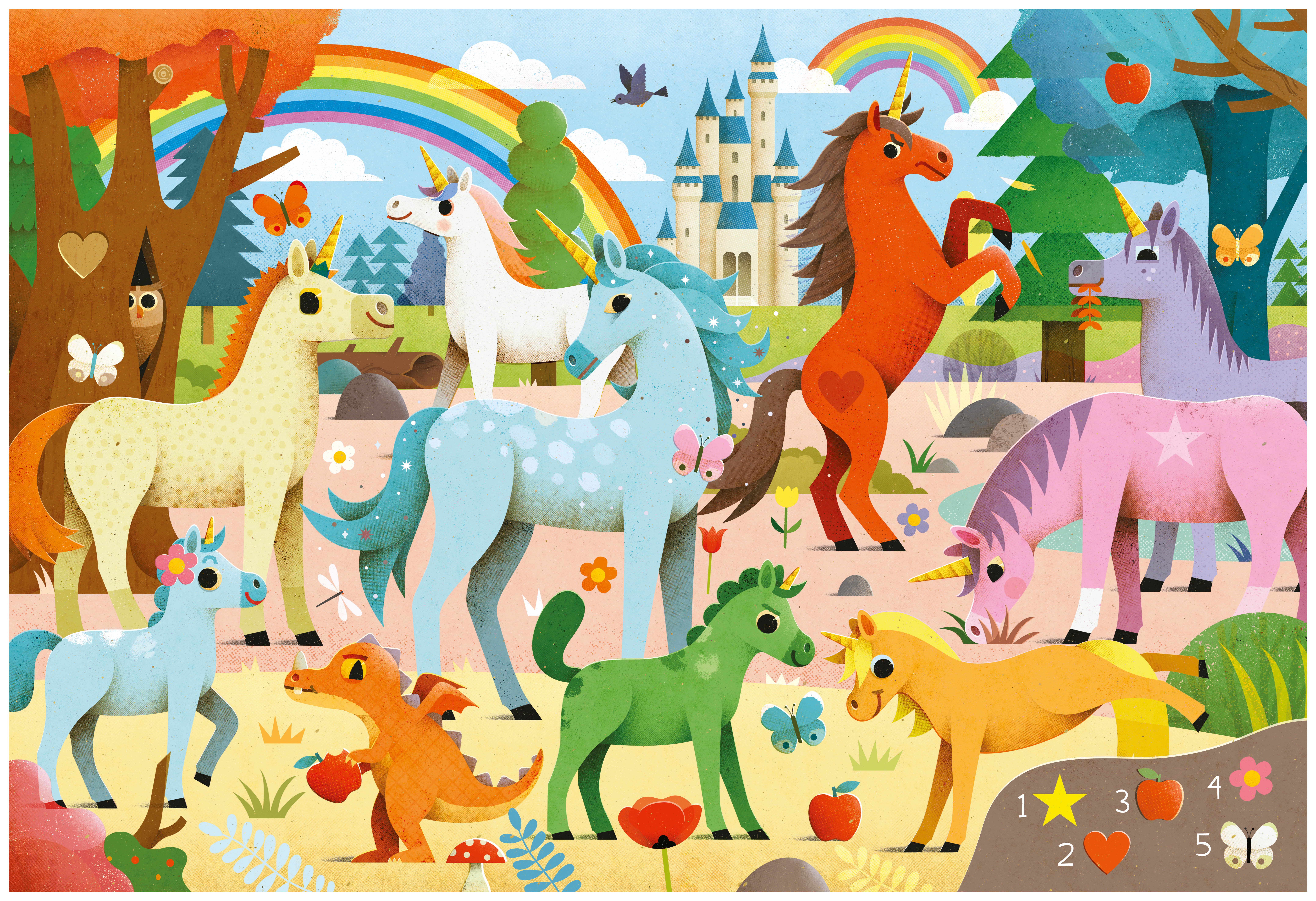 Freundliche Einhörner in einer magischen, bunten Landschaft: Mit dieser liebevoll gestalteten Puzzlebox machen Sie kleine Einhorn-Fans glücklich. Da gilt es ein Puzzle mit 36 Teilen aus stabiler Pappe zu entdecken, bei dem die Kids ganz alleine die Teile suchen, anfügen und sich über das immer größer werdende Bild freuen können. Ein großes Poster dient als Vorlage und ein Büchlein mit lustigen Einhorn-Fakten führt in die wundervolle Welt dieser fantastischen Tiere. Spielend trainieren die Kleinen mit dieser Box Kurzzeitgedächtnis, Konzentration und die Hand-Augen-Koordination. Eine einfach tolle Freizeitbeschäftigung, perfekt zum Mitnehmen für unterwegs!