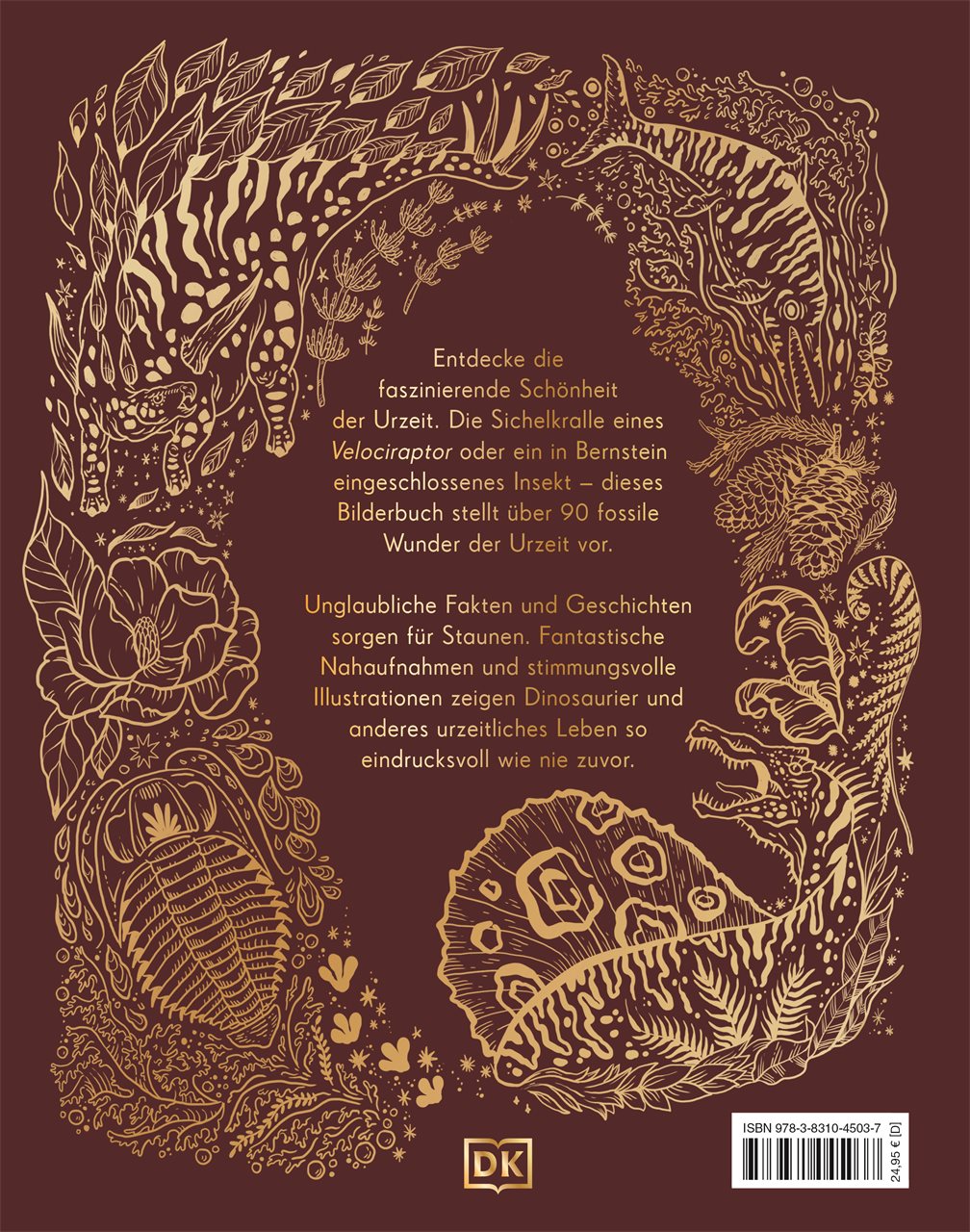 Von einer versteinerten Magnolie über die gepanzerten Knochenplatten eines Polacanthus bis zum perfekt erhaltenen Fell eines Riesenfaultiers - dieses stimmungsvolle Dinosaurierbuch zeigt über 90 Fossilien von Tieren und Pflanzen auf zauberhafte Weise! Beeindruckende Fotografien, Illustrationen und spannende Texte entführen junge Leser*innen in die faszinierende Welt der Urzeit. Das Sachbilderbuch wird dank Lesebändchen, Goldschnitt und Goldfolie auf dem Cover zum perfekten Geschenk zum Vorlesen und Schmökern für die ganze Familie.