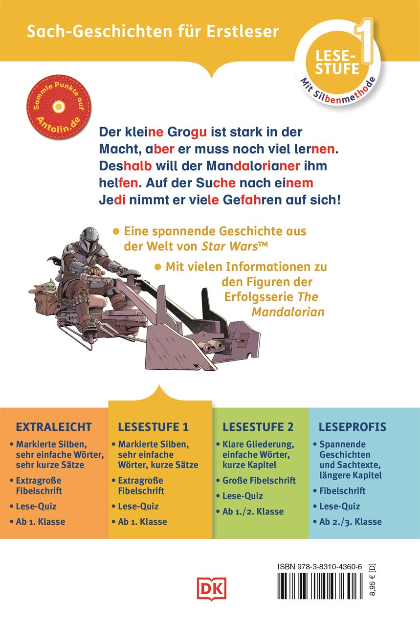 Dieses Erstlesebuch über Grogus Abenteuer in der Star Wars(TM) Galaxis eignet sich mit kurzen Sätzen, einfacher Sprache und extra großer Fibelschrift perfekt zur Leseförderung. Farbig markierte Silben, ein praktisches Lesebändchen und ein übersichtliches Glossar zum Nachschlagen der Wörter erleichtern das Lesenlernen - und mit dem Mix aus fesselnder Erzählung und spannendem Sachwissen zu den Figuren aus der Serie und kniffligem Quiz macht Lesen üben gleich dreimal so viel Spaß!