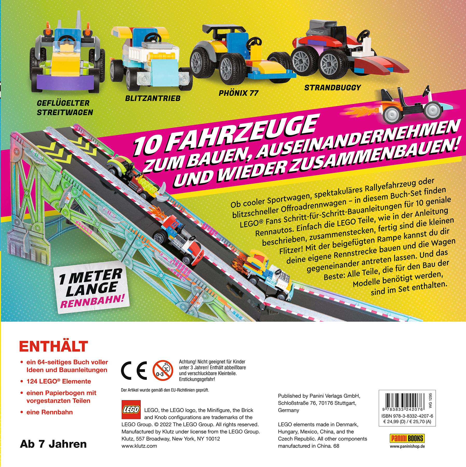 Ob schnittiger Sportwagen, rasantes Rallyefahrzeug oder blitzschneller Offroadrennwagen - in diesem Buch-Set finden LEGO® Fans Schritt-für-Schritt-Anleitungen für 10 geniale Rennautos. Einfach die LEGO® Teile, wie in der Anleitung beschrieben, zusammenstecken - schon sind die kleinen Flitzer fertig. Bau dir dann deine eigene Rennstrecke mit der beigefügten Rampe und lass die Wagen gegeneinander antreten. Und das Beste: Alle Teile, die für den Bau der Modelle benötigt werden, sind in dem Set enthalten.