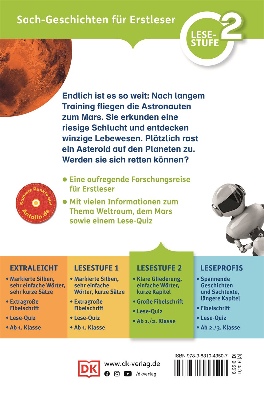 Bereit für eine unvergessliche Reise ins Jahr 2050? In diesem SUPERLESER!-Erstlesebuch starten fünf Astronauten und ein Kaninchen eine abenteuerliche Expedition zum Roten Planeten und entdecken gemeinsam mit den Leser*innen gigantische Schluchten und geheimnisvolle Lebewesen im Eis. Eine spannende Sach-Geschichte über eine faszinierende Forschungsreise in den Weltraum, dank klarer Gliederung, einfachem Wortschatz und Fotos perfekt für Leseanfänger*innen.