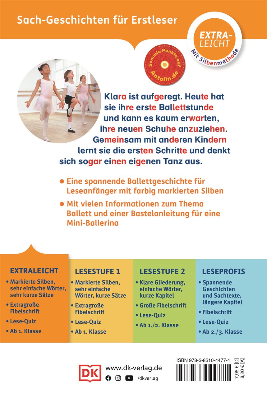 Wie wird man eine berühmte Ballett-Tänzerin? In diesem SUPERLESER!-Erstlesebuch kann es Klara kaum erwarten, ihre neuen Ballettschuhe anzuziehen und zu tanzen. Hoch auf die Fußspitzen, Kopf gerade, an der Stange stehen gar nicht so leicht! Zusammen mit den anderen Kindern macht sie nach, was ihre Ballettlehrerin Anna vormacht und darf sich am Ende sogar einen eigenen Tanz ausdenken. Ein spannender Blick in eine Ballettstunde, dank besonders einfacher Sprache und vielen Fotos perfekt für Leseanfänger*innen.
