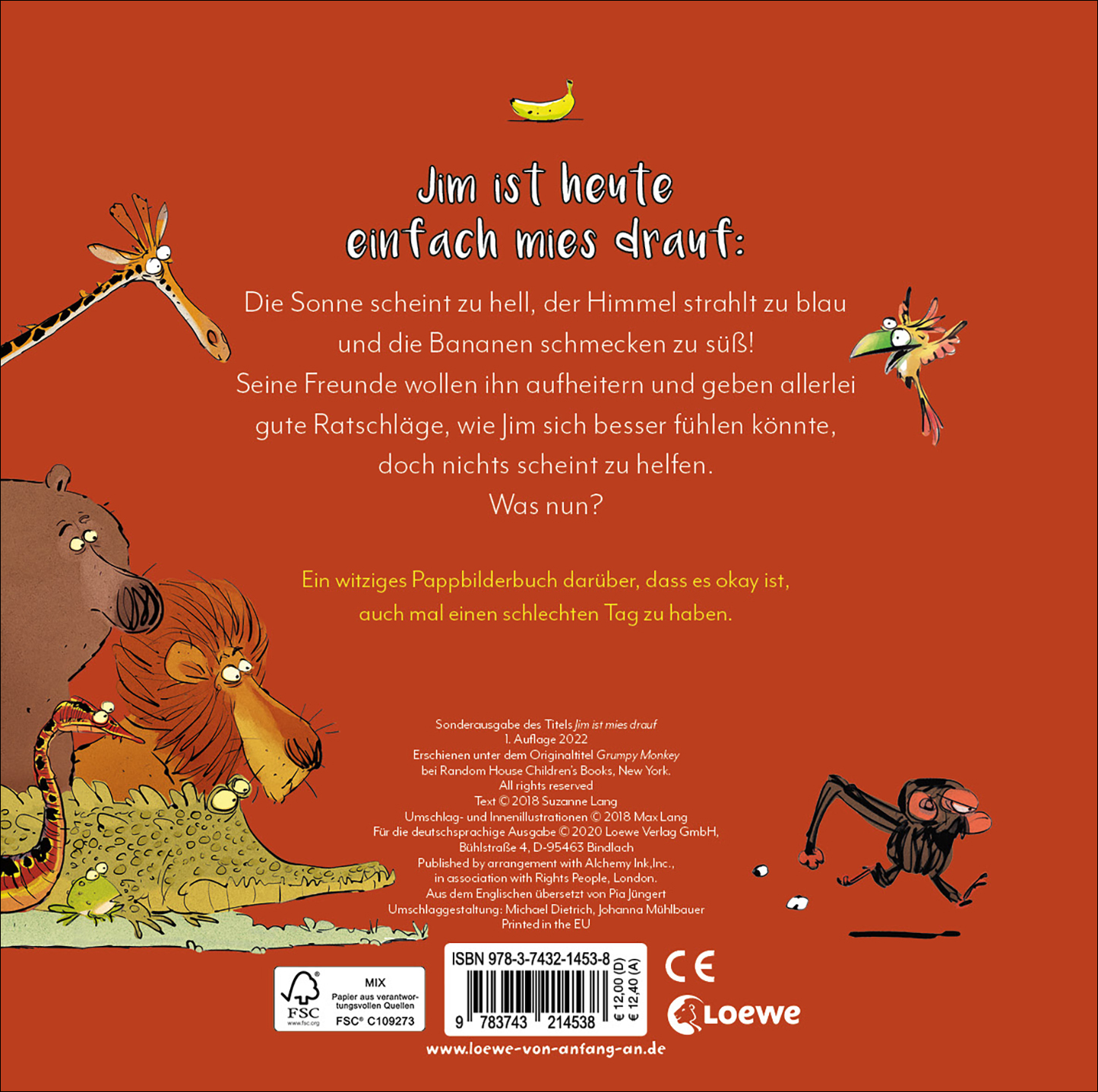 Jim ist heute einfach mies drauf: Die Sonne scheint zu hell, der Himmel strahlt zu blau und die Bananen schmecken zu süß! Seine Freunde wollen ihn aufheitern und geben allerlei gute Ratschläge, wie er sich besser fühlen kann, doch nichts scheint zu helfen. Kann es sein, dass heute einfach ein besonders guter Schlechtelaunetag ist? Dieses witzige Bilderbuch hilft dabei, auch die schwer greifbaren Gefühlen zu verstehen und mit ihnen umzugehen und dabei deutlich macht: Es ist okay, auch mal einen schlechten Tag zu haben.