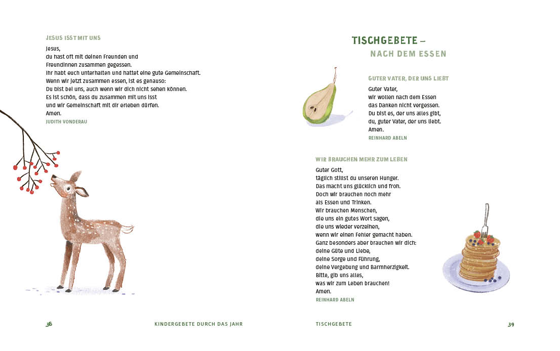 Das Buch ist eine Sammlung der beliebtesten Kindergebete, Segensverse für Kinder, Kinderlieder vom lieben Gott und die schönsten biblischen Geschichten für Kinder. Inhalt: Kindergebete durch den Tag und durch das Jahr, Feste im Jahreskreis, Kinderlieder, Kinderbibelerzählungen, die schönsten Bibelverse für Kinder, Bastelanleitungen (z.B. Gebetswürfel aus Papier, Gebetsanliegen auf Papiersternen, Schutzengel-Anhänger) und frei gestaltbare Seiten für persönliche Gebete, Ausfüllgebete für die Familie etc.