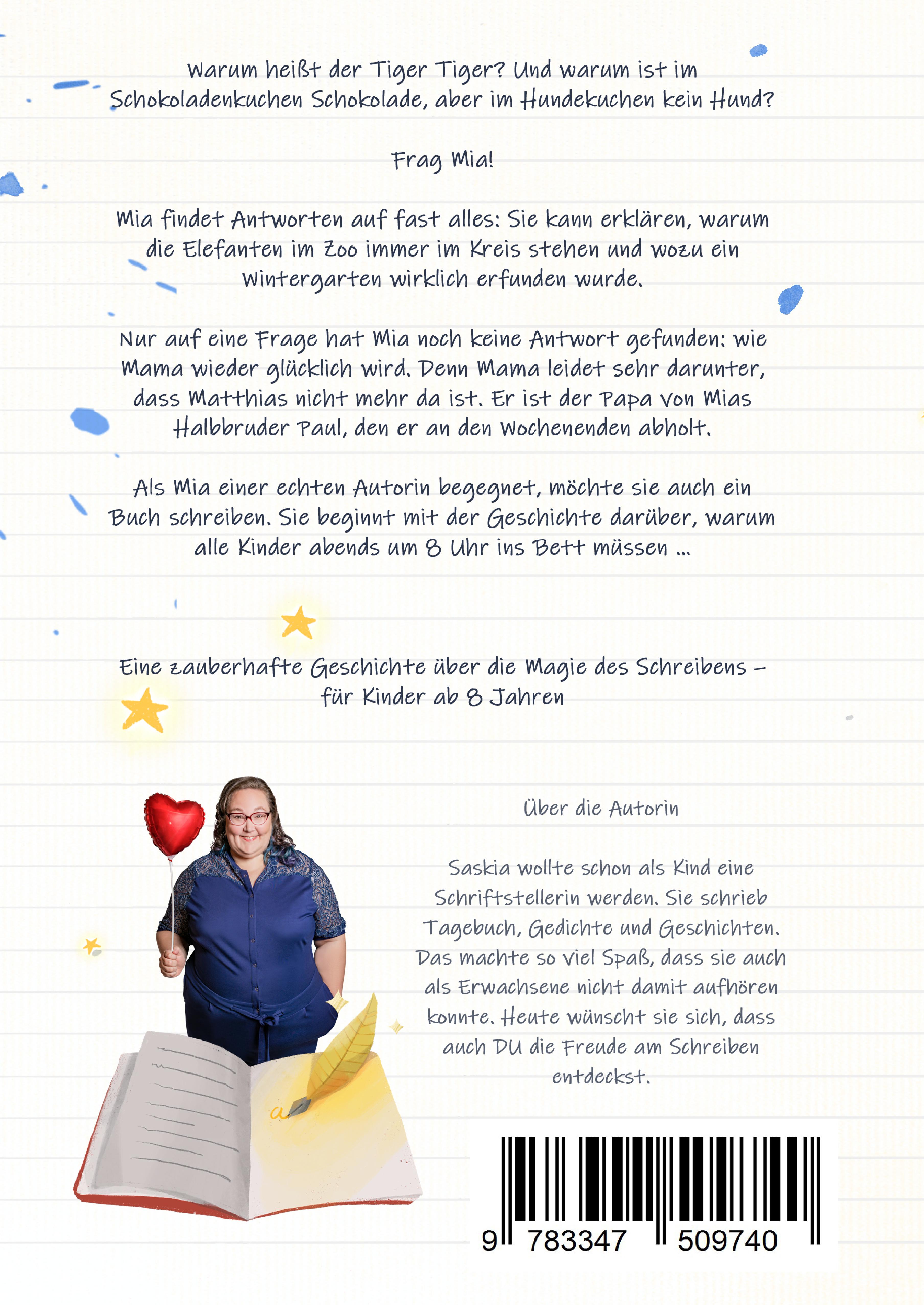Eine zauberhafte Geschichte über die Magie des Schreibens - für Kinder ab 8 JahrenMit farbigen IllustrationenWarum heißt der Tiger Tiger? Und warum ist im Schokoladenkuchen Schokolade, aber im Hundekuchen kein Hund?Frag Mia!Mia findet Antworten auf fast alles: Sie kann erklären, warum die Elefanten im Zoo immer im Kreis stehen und wozu ein Wintergarten wirklich erfunden wurde.Nur auf eine Frage hat Mia noch keine Antwort gefunden: wie Mama wieder glücklich wird. Denn Mama leidet sehr darunter, dass Matthias nicht mehr da ist. Er ist der Papa von Mias Halbbruder Paul, den er an den Wochenenden abholt.Als Mia einer echten Autorin begegnet, möchte sie auch ein Buch schreiben. Sie beginnt mit der Geschichte darüber, warum alle Kinder abends um acht Uhr ins Bett müssen ...Tipp: Eine großartige Geschichte für Kinder ab 8 Jahren, die viel Fantasie haben, sehr kreativ sind oder die zum Schreiben angeregt werden sollen! Leg das Buch gleich in den Einkaufswagen und inspiriere ein kreatives Kind!