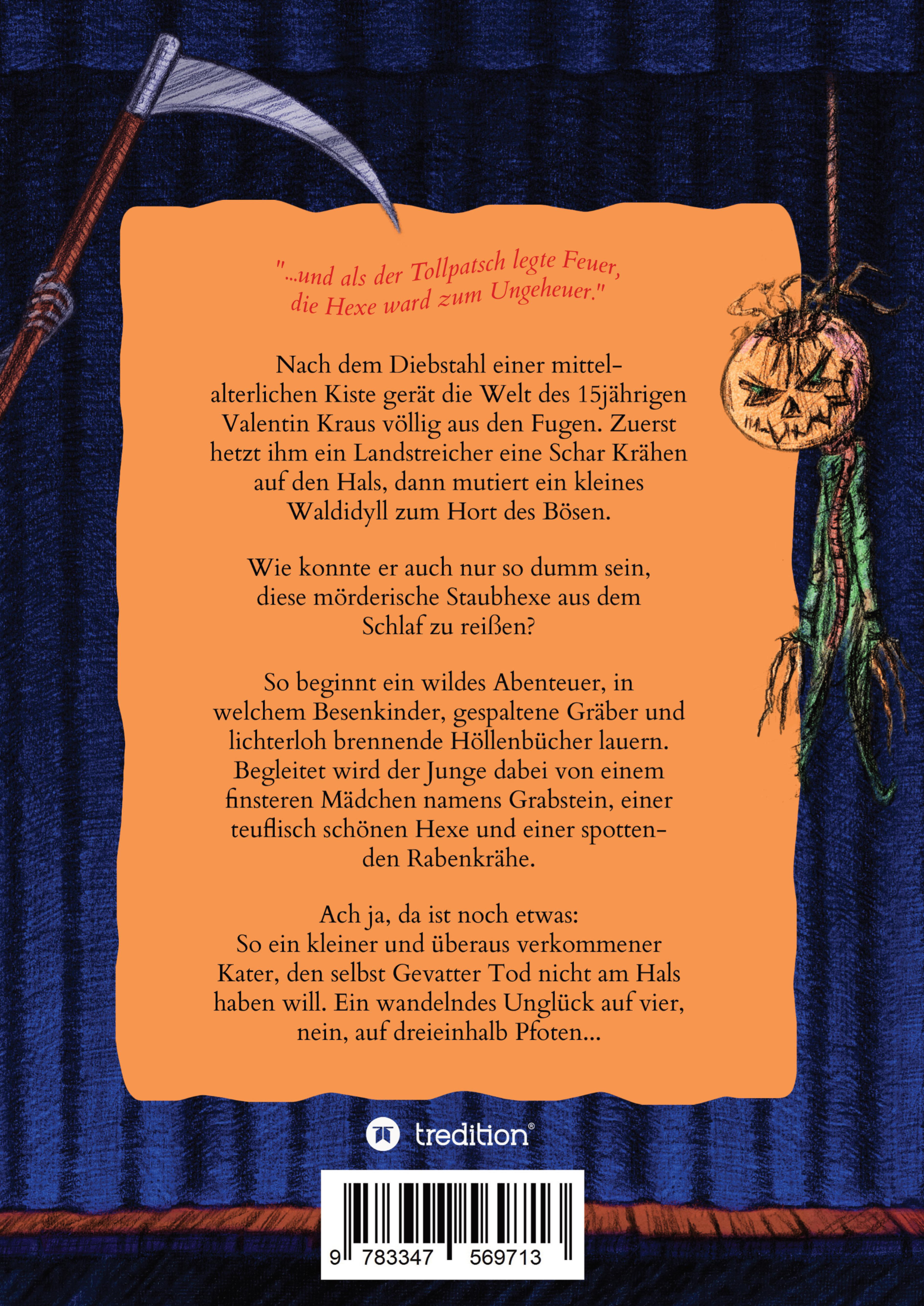 "...und als der Tollpatsch legte Feuer, die Hexe ward zum Ungeheuer."Nach dem Diebstahl einer mittelalterlichen Kiste gerät die Welt des 15jährigen Valentin Kraus völlig aus den Fugen. Zuerst hetzt ihm ein Landstreicher eine Schar Krähen auf den Hals, dann mutiert ein kleines Waldidyll zum Hort des Bösen. Wie konnte er auch nur so dumm sein, diese mörderische Staubhexe aus dem Schlaf zu reißen? So beginnt ein wildes Abenteuer, in welchem Besenkinder, gespaltene Gräber und lichterloh brennende Höllenbücher lauern.Begleitet wird der Junge dabei von einem finsteren Mädchen namens Grabstein, einer teuflisch schönen Hexe und einer spottenden Rabenkrähe.Ach ja, da ist noch etwas: So ein kleiner und überaus verkommener Kater, den selbst Gevatter Tod nicht am Hals haben will. Ein wandelndes Unglück auf vier, nein, auf dreieinhalb Pfoten...