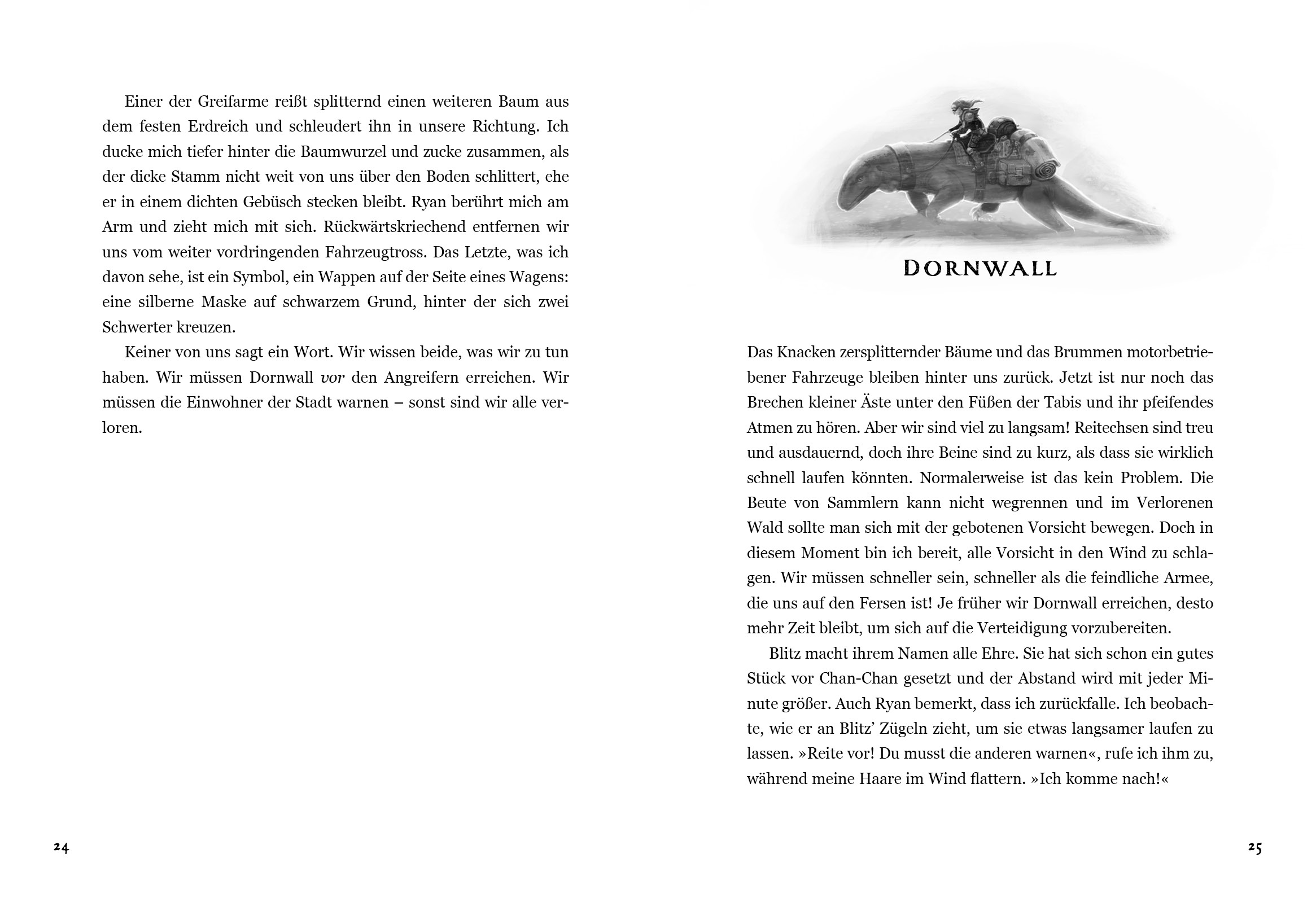 »In der Schule wurde uns erzählt, dass es irgendwann mehrere Milliarden von Menschen gab, die so viele Maschinen benutzten, dass die Energie nicht mehr reichte und aller Treibstoff schließlich aufgebraucht war. Das war der Grund, aus dem sie anfingen, zu kämpfen. Und dann starb die Welt. Milliarden von Menschen. Das klingt für mich unvorstellbar. In Dornwall leben nicht einmal achthundert. Und es ist eine der größeren Städte.«