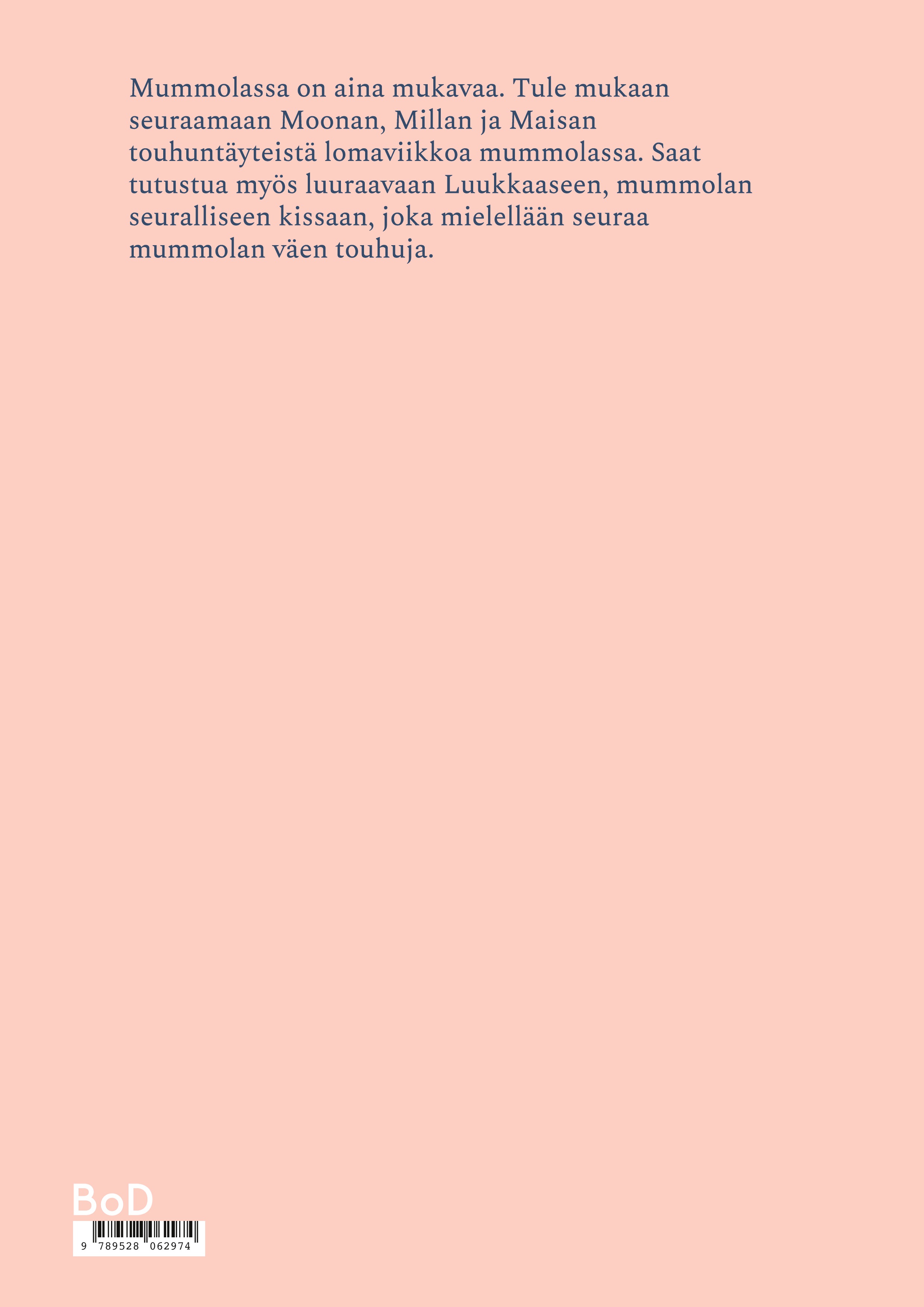 Mummolassa on aina mukavaa. Tule mukaan seuraamaan Moonan, Millan ja Maisan touhuntäyteistä lomaviikkoa mummolassa. Saat tutustua myös luuraavaan Luukkaaseen, mummolan seuralliseen kissaan, joka mielellään seuraa mummolan väen touhuja.
