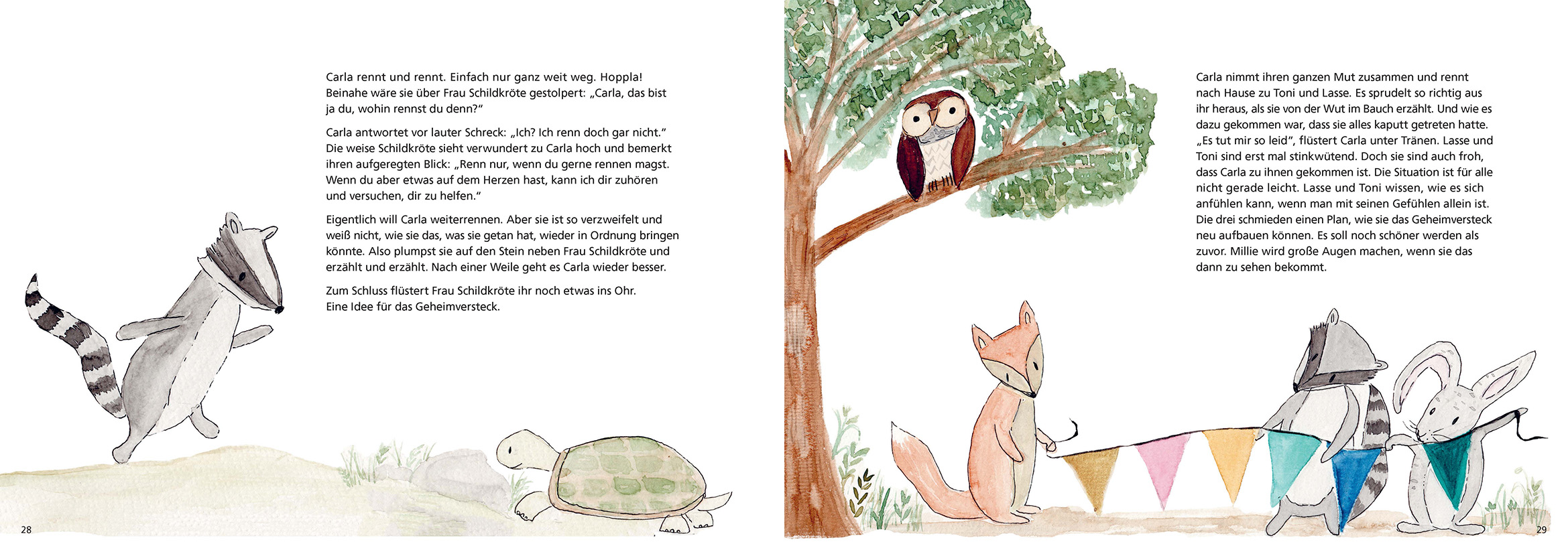Die Tierkinder im Wunderwald spielen am liebsten zwischen den großen alten Bäumen Verstecken. Als eines Tages das Rehmädchen Millie zusammenbricht und ins Krankenhaus muss, ist der Schreck bei ihren Spielgefährten groß. Sie alle reagieren mit unterschiedlichen Gefühlen: Während der kleine Fuchs Lasse Angst hat, schuld an Millies Krankheit zu sein, wird Waschbärmädchen Carla wütend. Schließlich dreht sich alles nur noch um das kranke Reh und niemand kümmert sich mehr um die übrigen Tierkinder.