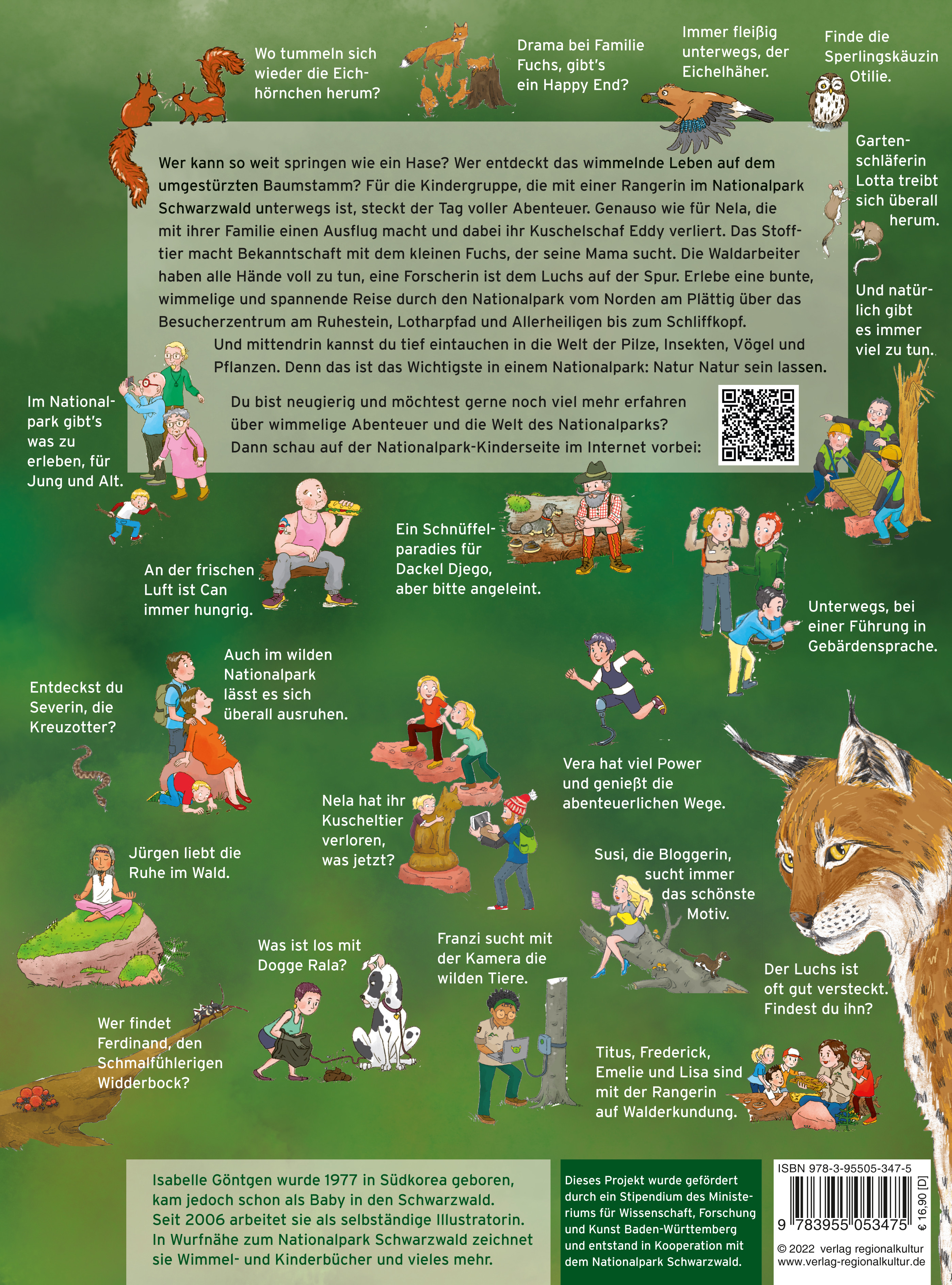 Wer kann so weit springen wie ein Hase? Wer entdeckt das wimmelnde Leben auf dem umgestürzten Baumstamm? Für die Kindergruppe, die mit einer Rangerin im Nationalpark Schwarzwald unterwegs ist, steckt der Tag voller Abenteuer. Genauso wie für Nela, die mit ihrer Familie einen Ausflug macht und dabei ihr Kuschelschaf Eddy verliert. Das Stofftier macht Bekanntschaft mit dem kleinen Fuchs, der seine Mama sucht. Die Waldarbeiter haben alle Hände voll zu tun, eine Forscherin ist dem Luchs auf der Spur. Erlebe eine bunte, wimmelige und spannende Reise durch den Nationalpark vom Norden am Plättig über das Besucherzentrum am Ruhestein, Lotharpfad und Allerheiligen bis zum Schliffkopf. Und mittendrin kannst du tief eintauchen in die Welt der Pilze, Insekten, Vögel und Pflanzen. Denn das ist das Wichtigste in einem Nationalpark: Natur Natur sein lassen.