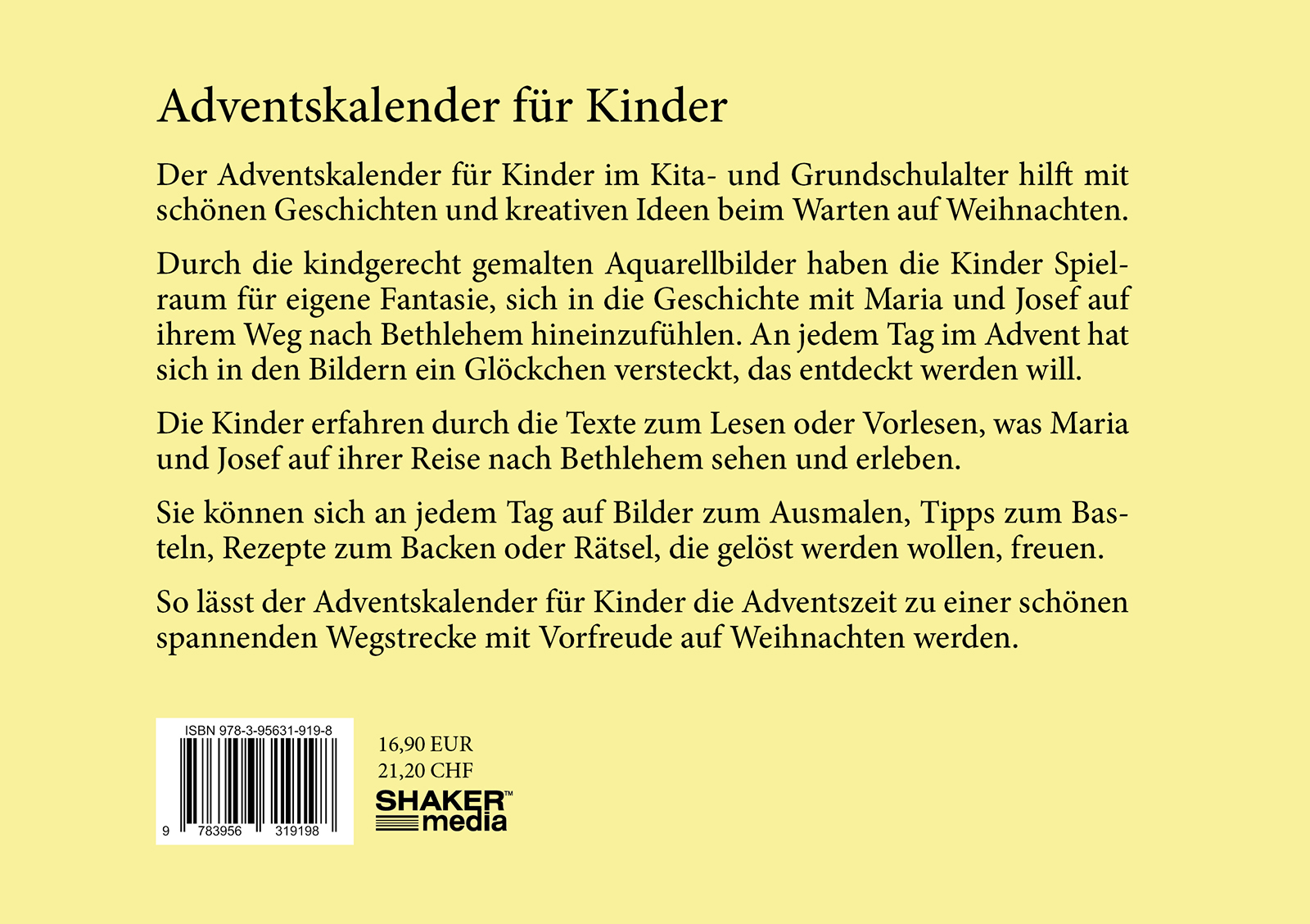 Der Adventskalender für Kinder im Kita- und Grundschulalter hilft mit schönen Geschichten und kreativen Ideen beim Warten auf Weihnachten. Durch die kindgerecht gemalten Aquarellbilder haben die Kinder Spielraum für eigene Fantasie, sich in die Geschichte mit Maria und Josef auf ihrem Weg nach Bethlehem hineinzufühlen. An jedem Tag im Advent hat sich in den Bildern ein Glöckchen versteckt, das entdeckt werden will. Die Kinder erfahren durch die Texte zum Lesen oder Vorlesen, was Maria und Josef auf ihrer Reise nach Bethlehem sehen und erleben. Sie können sich an jedem Tag auf Bilder zum Ausmalen, Tipps zum Basteln, Rezepte zum Backen oder Rätsel, die gelöst werden wollen, freuen. So lässt der Adventskalender für Kinder die Adventszeit zu einer schönen spannenden Wegstrecke mit Vorfreude auf Weihnachten werden.