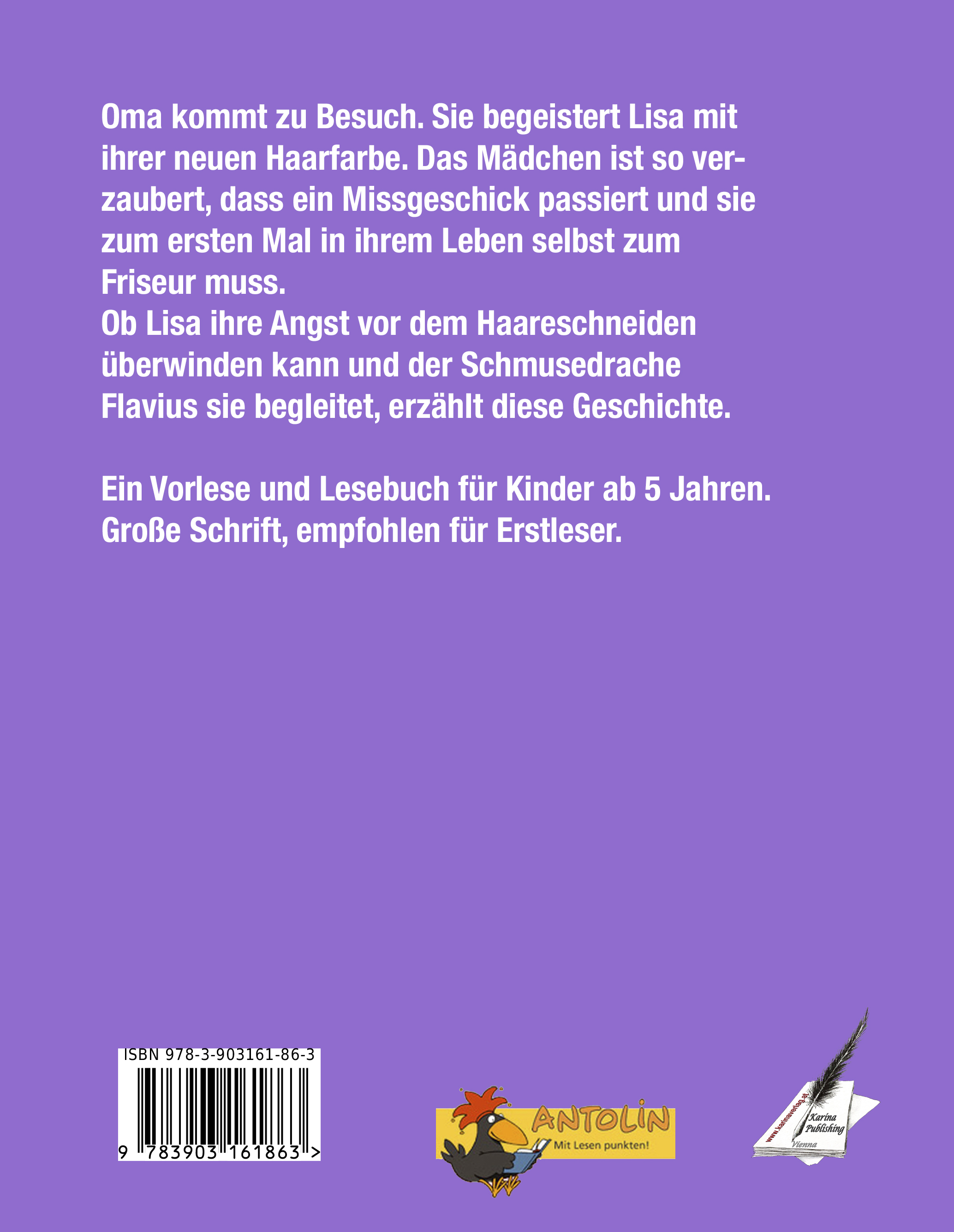 Oma kommt zu Besuch. Sie begeistert Lisa mit ihrer neuen Haarfarbe. Das Mädchen ist so verzaubert, dass ein Missgeschick passiert und sie zum ersten Mal in ihrem Leben selbst zum Friseur muss.Ob Lisa ihre Angst vor dem Haareschneiden überwinden kann und der Schmusedrache Flavius sie begleitet, erzählt diese Geschichte.Ein Vorlese und Lesebuch für Kinder ab 5 Jahren.Große Schrift, empfohlen für Erstleser.Für dieses Buch findet sich ein Leserätsel bei "Antolin"