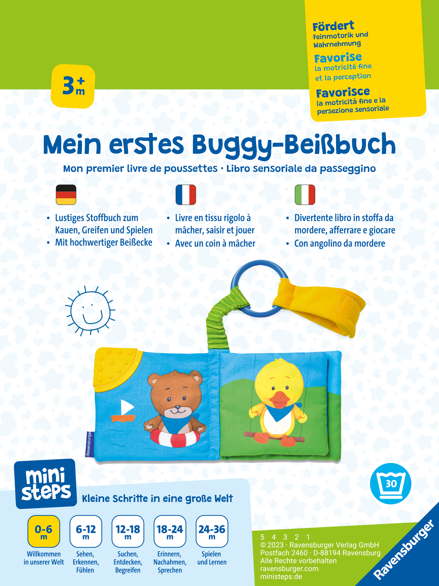 Knabbern, Greifen und Spielen! Dieses kuschelweiche Buggy-Beißbuch kann mit allen Sinnen erkundet werden. Die hochwertige Beißecke mit spannender Oberfläche, lustige Satin-Laschen sowie fröhlich-bunte Motive mit den fünf ministeps Freunden laden schon die Allerkleinsten zum Anschauen, Entdecken und Erforschen ein. Dank Klettverschluss lässt sich dieses kuschelige Stoffbuch kinderleicht überall befestigen. So ist es immer dabei!