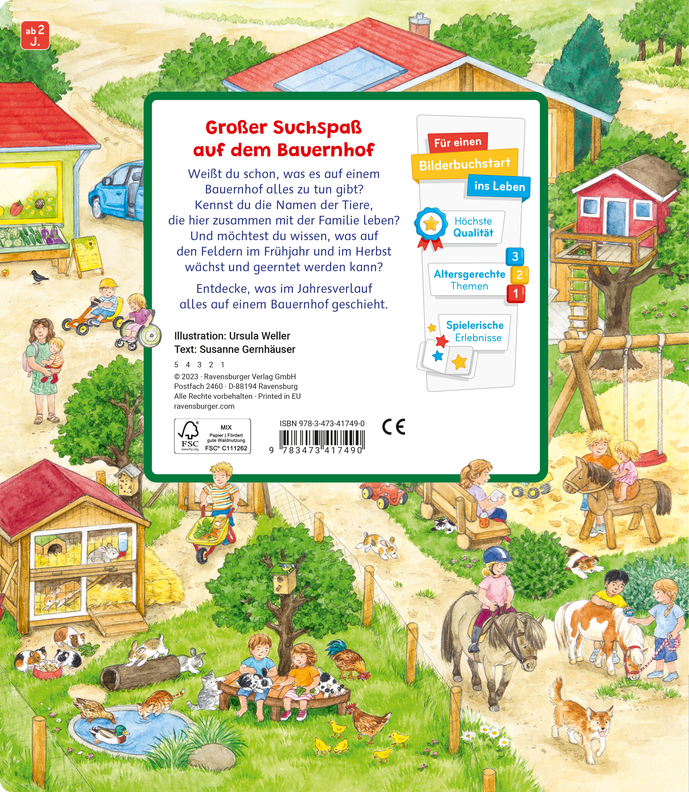 Der Bauernhof mit all seinen Tieren übt schon auf kleine Kinder eine große Anziehungskraft aus. Auf elf großformatigen Wimmelbildern gibt es hier nicht nur viel zu sehen, hier kann auch viel Neues über die Menschen und Tiere die auf einem Bauernhof zusammen leben, dazu gelernt werden. Der begleitende Text fordert immer mit einem Suchauftrag dazu auf, die kleinen Bilder am Rand im Schaubild wiederzufinden. Die Beschriftungen unter den Suchbildern helfen dabei, Gegenstände, Fahrzeuge und Werkzeuge zu benennen. Das macht Spaß und unterstützt nebenbei auch den Spracherwerb. Das Suchen vertieft die Beschäftigung mit den Bildern. Ein Familien-Bauernhofbuch, das nicht nur Kindern Freude macht.
