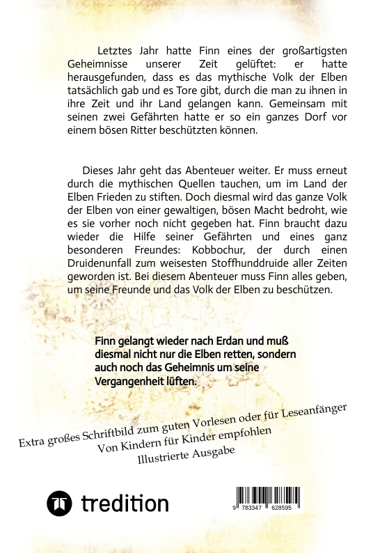 Letztes Jahr hatte Finn eines der großartigsten Geheimnisse unserer Zeit gelüftet: er hatte herausgefunden, dass es das mythische Volk der Elben tatsächlich gab und es Tore gibt, durch die man zu ihnen in ihre Zeit und ihr Land gelangen kann. Gemeinsam mit seinen zwei Gefährten hatte er so ein ganzes Dorf vor einem bösen Ritter beschützten können. Dieses Jahr geht das Abenteuer weiter. Er muss erneut durch die mythischen Quellen tauchen, um im Land der Elben Frieden zu stiften. Doch diesmal wird das ganze Volk der Elben von einer gewaltigen, bösen Macht bedroht, wie es sie vorher noch nicht gegeben hat. Finn braucht dazu wieder die Hilfe seiner Gefährten und eines ganz besonderen Freundes: Kobbochur, der durch einen Druidenunfall zum weisesten Stoffhunddruide aller Zeiten geworden ist. Bei diesem Abenteuer muss Finn alles geben, um seine Freunde und das Volk der Elben zu beschützen.