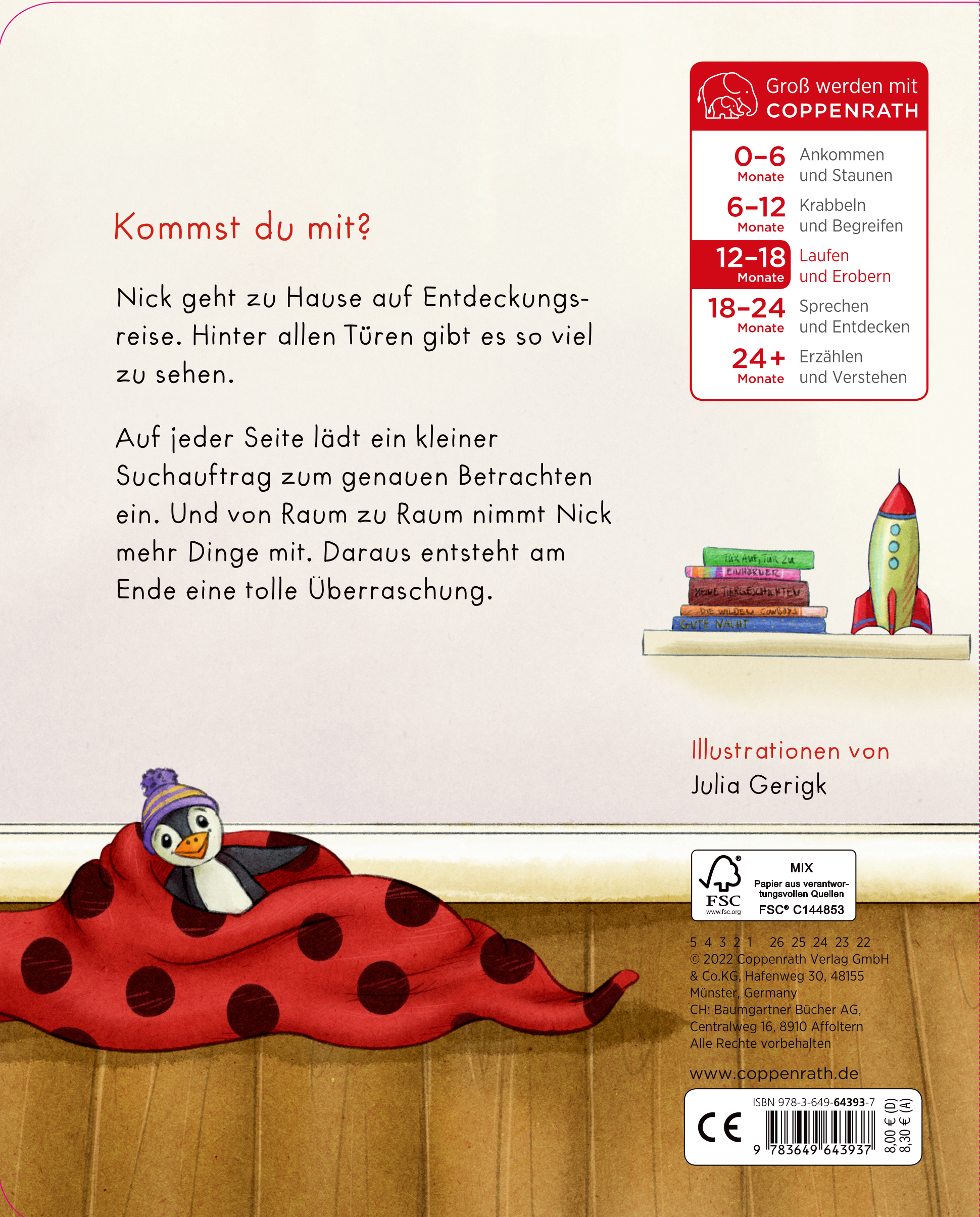 Kommst du mit? Nick geht zu Hause auf Entdeckungsreise. Hinter all den großen Türen gibt es so viel zu sehen! Auf jeder Seite lädt ein kleiner Suchauftrag zum genauen Betrachten ein. Und von Raum zu Raum nimmt Nick mehr Dinge mit. Daraus entsteht auf der letzten Seite eine tolle Überraschung!