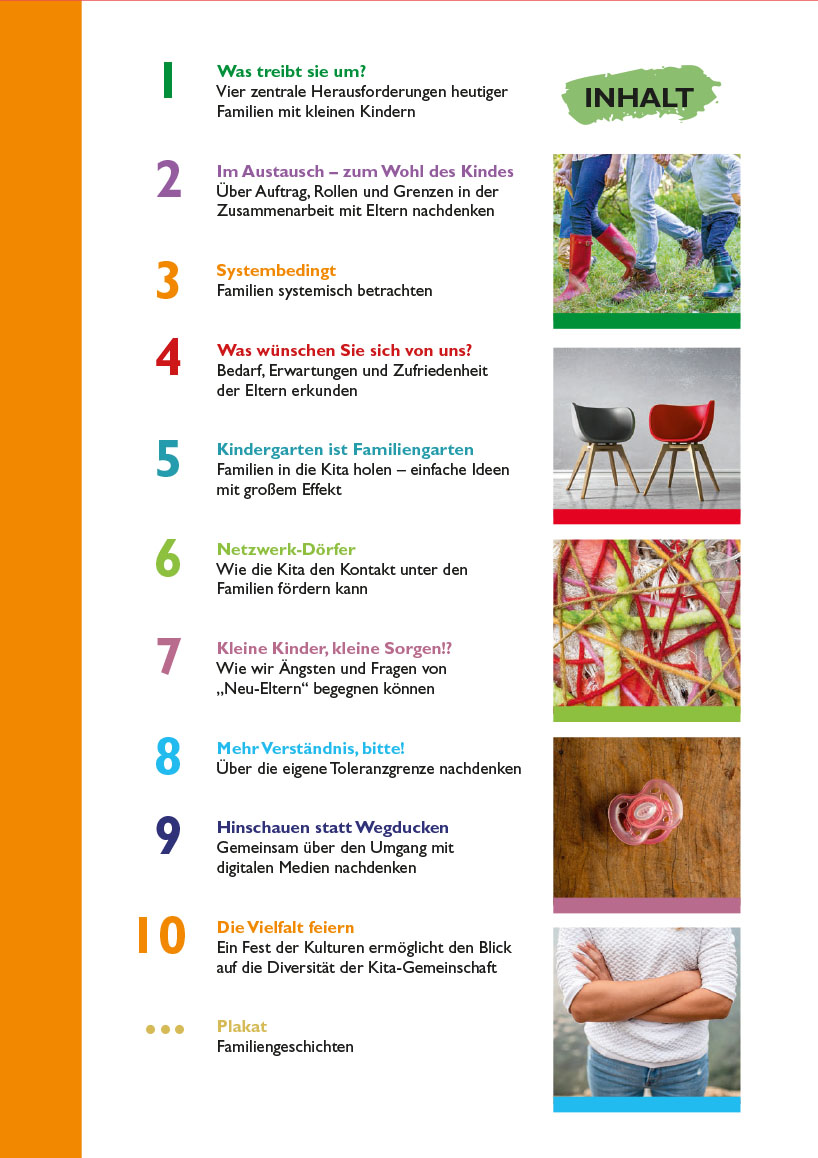 | Schlagworte | Bedarf • Eltern • Elternabend • Elternbefragung • Eltern-Netzwerk • Erwartungen • Erzieherin • Erziehungspartnerschaft • Familienrucksack • Familiensystem • Frühpädagogik • Herausforderungen junger Familien • Impulse • Junge Eltern • KiTa-Team • Kommunikation • Methoden • Pädagogische Fachkraft • Perspektivwechsel • Praxisideen • Reflexion • Selbstreflexion • Zufriedenheit |