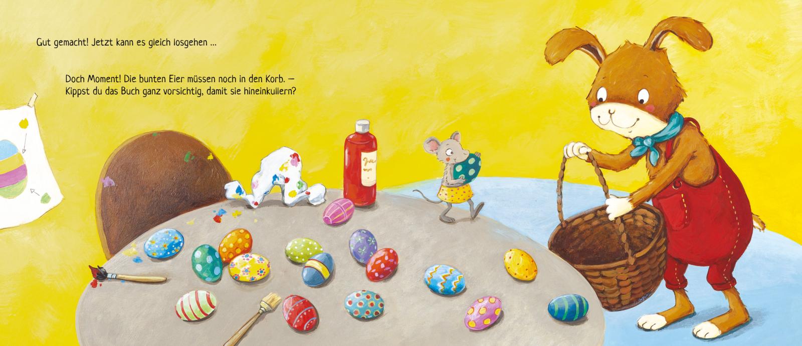 Emil, der kleine Osterhase, hat verschlafen! Die Allerkleinsten dürfen ihm beim Anziehen, Ohrenbürsten und Eierbemalen helfen. Einfach über die Seiten streichen, auf das Buch pusten, es kippen oder drehen. Es ist ganz einfach und macht Riesenspaß! Und der kleine Osterhase freut sich: Denn die Eier landen rechtzeitig im Osternest.