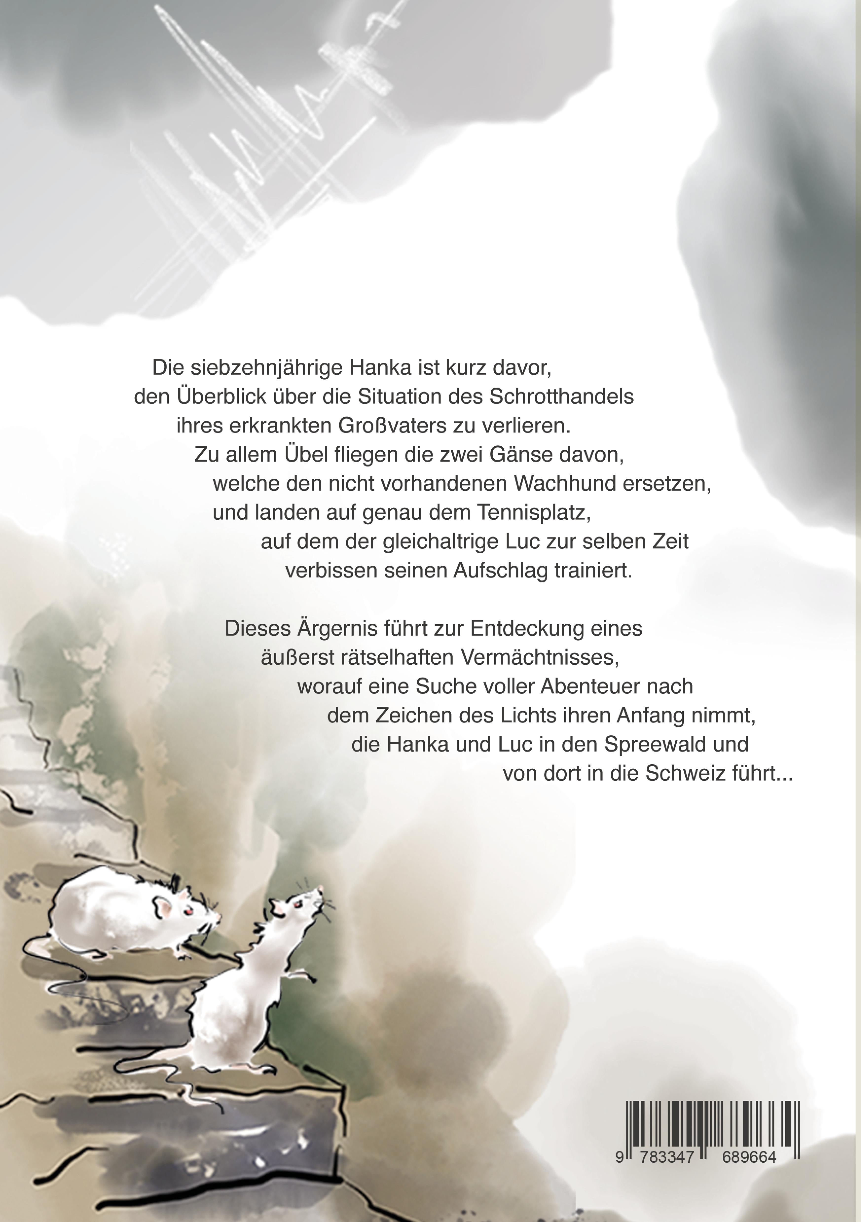 Die siebzehnjährige Hanka sitzt in ihrem zur Wohnstatt umgebauten Eisenbahnwaggon vor Bergen von Geschäftspost und unbezahlten Rechnungen. Der Schrotthandel ihres Großvaters steht unmittelbar vor dem Ruin. Zudem wird die finanzielle Förderung bei der örtlichen Musikhochschule in Kürze auslaufen. Als zu allem Übel die beiden Wachgänse am Abteilfenster vorbeifliegen, die eigentlich das Betriebsgelände zu bewachen haben, ist ihr nicht im Geringsten bewusst, dass dieses unerfreuliche Ereignis einschneidende mittel- und langfristige Folgen für ihr weiteres Leben haben wird ...Sie zieht los, um die Tiere wieder einzufangen. Dabei lernt sie den etwa gleichaltrigen Luc kennen, der in einer luxuriösen Jugendstilvilla lebt, die in einen parkähnlichen Garten eingebettet ist. Kurze Zeit später entdeckt Hanka unter dem Kinnhalter ihrer Violine einen uralten Zettel, auf dem eine verschlüsselte Botschaft ihres Urgroßvaters notiert ist. Luc hilft ihr bei der Dechiffrierung. Ein rätselhaft bleibender Hinweis auf ein so bezeichnetes Zeichen des Lichts, welches angeblich den Weg zu etwas weist, das gemäß dem Vermächtnis in den Besitz von Hanka übergehen wird, lässt sie nicht mehr los ...Die beiden werden in den Strudel eines irrwitzigen Reiseabenteuers gezogen, das eine turbulente Kette von Geschehnissen zur Folge hat. Es kommt zu zahlreichen Begegnungen mit Rockern, Satanisten, einem Sumoringer, einem Autisten ... Diese ungewöhnlichen Beteiligten sind außergewöhnlich, manchmal hilfsbereit, ein anderes Mal gruselig, teils skrupellos oder gar ulkig.Werden Hanka und Luc es schaffen, ihre Gegenspieler zu überlisten und die weiteren auf ihrem Weg liegenden Hindernisse zu bewältigen? Wird es den beiden gelingen, den Schleier um das Geheimnis des Vermächtnisses zu lüften?"Buchtipp bei pressenet.info: Turbulente Action und kuriose Charaktere - Ein toller Spannungsroman für jedes Lesealter ab 14 Jahrenl"