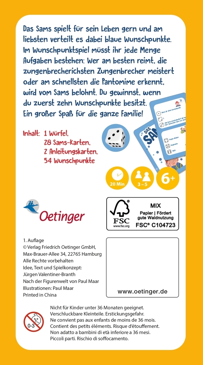| Schlagworte | Das Sams • Familienspiel • Grundschulkind • Kartenspiel • Kinderbuch ab 6 • Kinderbücher ab 6 Jahre • Kreativität • pädagogisch wertvoll • Paul Maar • Reimwörter • Spaß • Spiel ab 6 Jahren • Spielen und lernen • Sprache • Sprachgefühl • Wortspiele • Zungenbrecher |