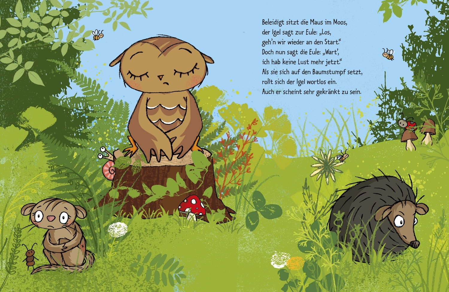 lt;p>Die kleine Eule macht ein Wettrennen mit dem Igel. Als die Haselmaus hinzukommt und mit der Eule spielen möchte, lädt die Eule sie ein, einfach mitzulaufen. Doch die Haselmaus fühlt sich dafür viel zu klein und dann passiert aus Versehen auch noch ein Unfall! Jetzt beschimpfen sich Igel und Haselmaus - und die kleine Eule steckt mitten zwischen ihren Freunden. Keinem von beiden kann sie es recht machen. Als ein Sonnenstrahl die kleine Eule kitzelt und die drei Streitenden aus der Situation reißt, ist plötzlich alles wieder gut. Einander kitzelnd lachen sie zu dritt und haben sich wieder lieb.