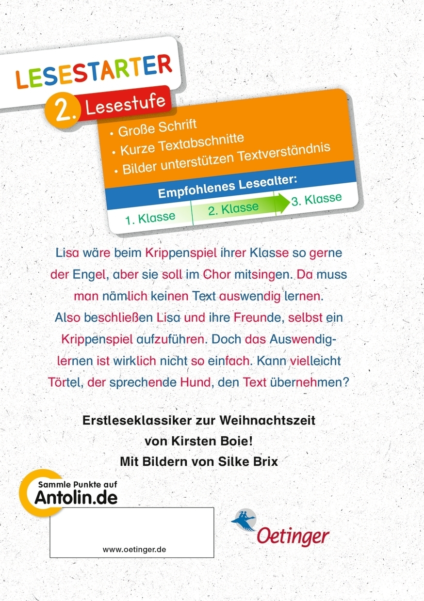 | Schlagworte | 2. Klasse • 3. Klasse • Diversität • Engel • Grundschule • Leseanfänger • Lesen lernen • Schule • Theater • Weihnachtsgeschenk |