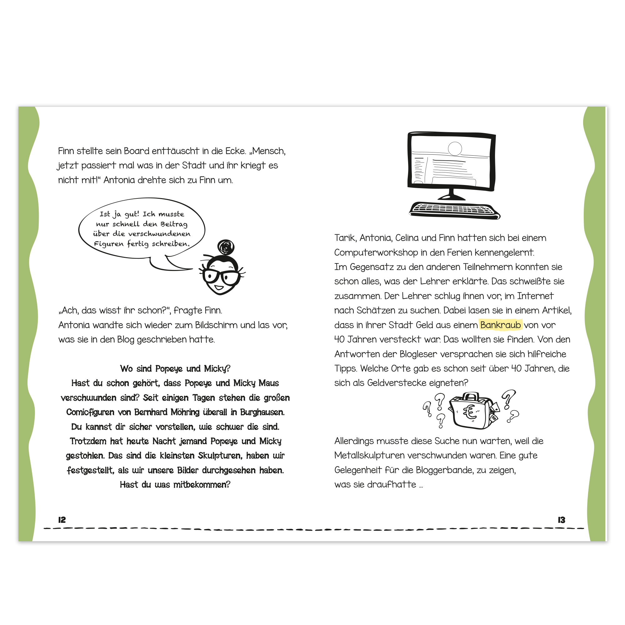 - Ein crossmediales Leseerlebnis und Comic-Roman mit Klick: Über QR-Codes im Buch landet man auf weitere spannende, kindgerechte Artikel im Internet-Blog der Bloggerbande.