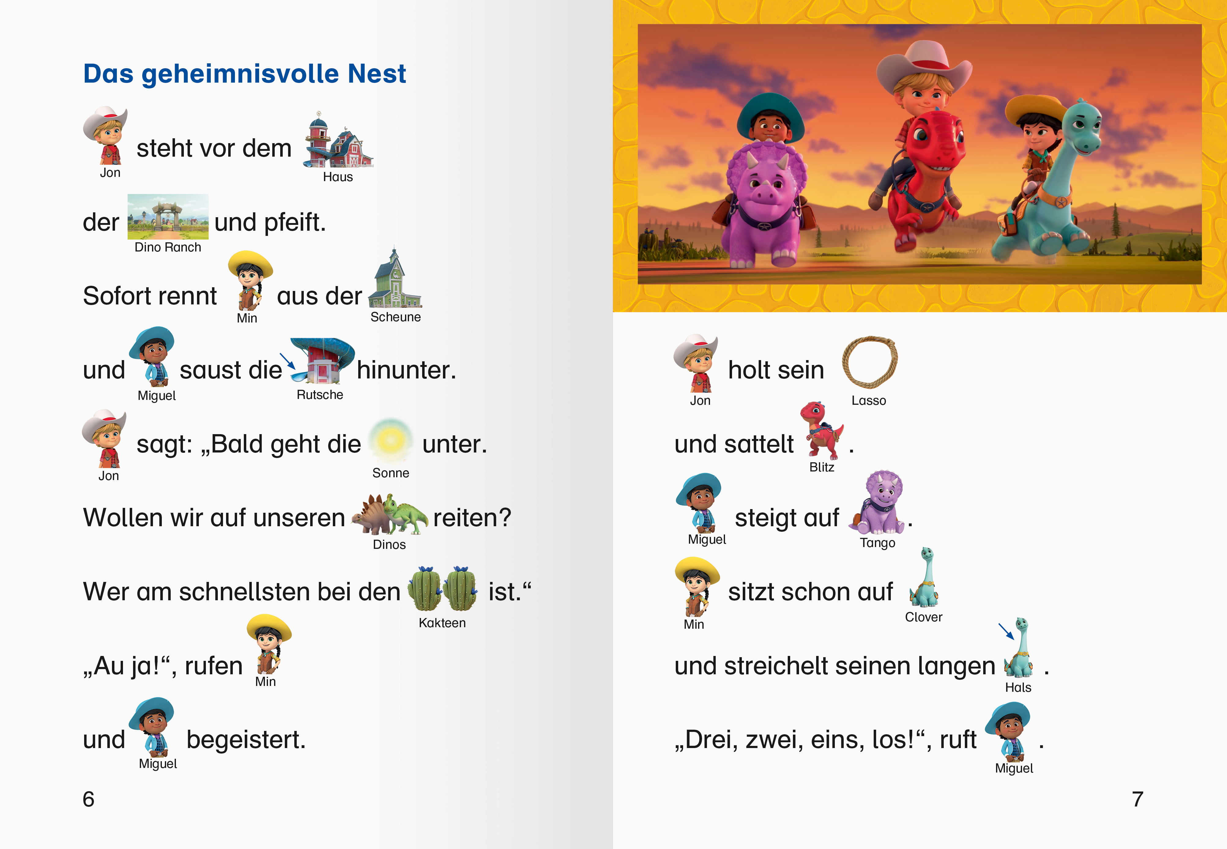 Auf der Dino Ranch geht's rund: Die Kinder Jon, Min und Miguel finden ein verlassenes Dino-Ei! Als der Baby-Dino schlüpft, nehmen sich die drei des Kleinen an und werden dabei vor so manch eine Herausforderung gestellt. Doch gemeinsam schaffen sie alles! "Gemeinsam" ist ein gutes Stichwort, denn in diesem Buch ersetzen Bilder die Hauptwörter, sodass bereits Vorschulkinder mitlesen können - spaßige Lesezeit garantiert!