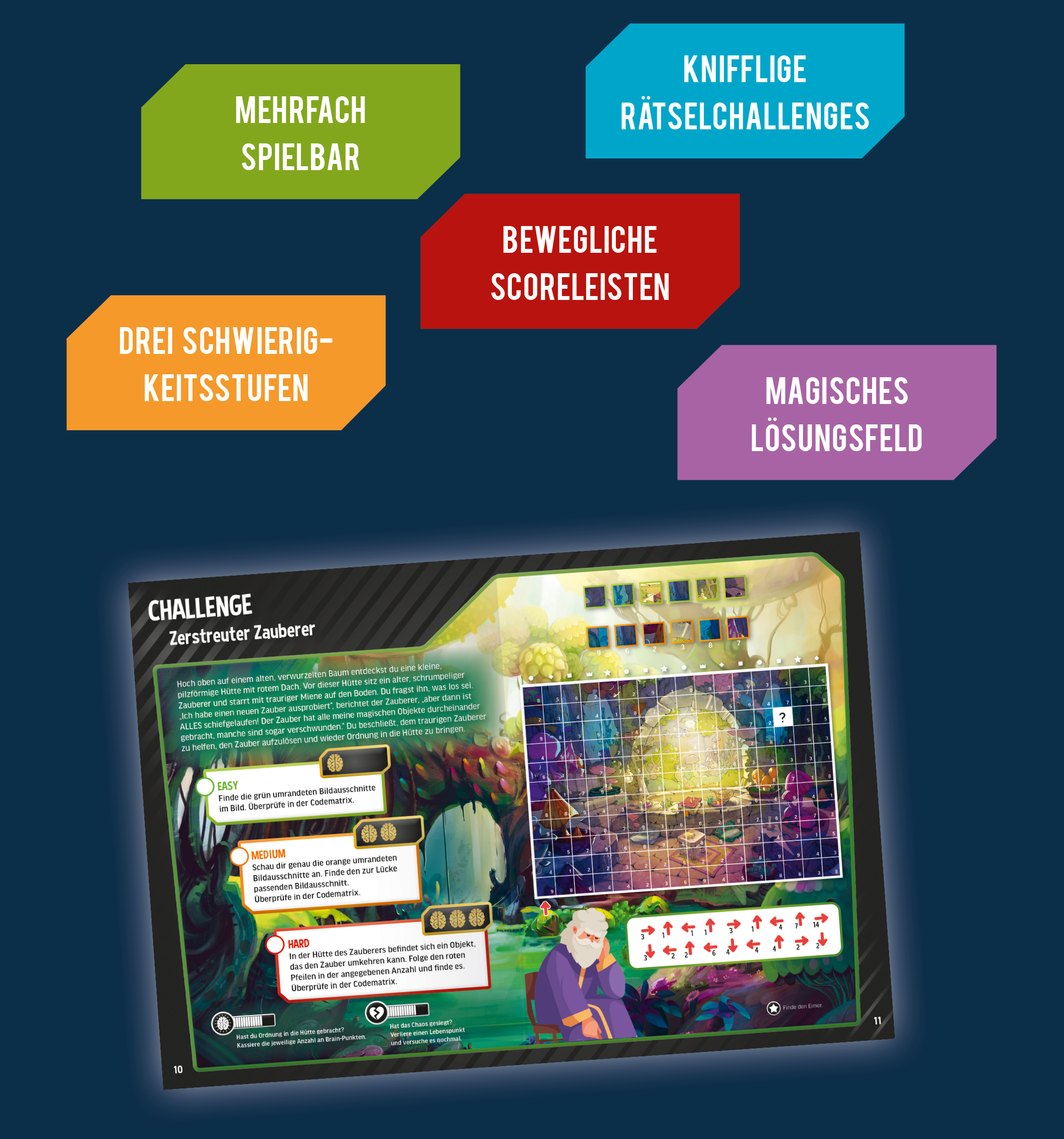 Das Buch ist mehrfach spielbar: Immer wieder und auf verschiedenen Rätsel-Wegen können sich die Challenge-Fans mit dem Rätsel-Game-Buch messen. Dabei wählen sie die Schwierigkeitsstufen selbst.