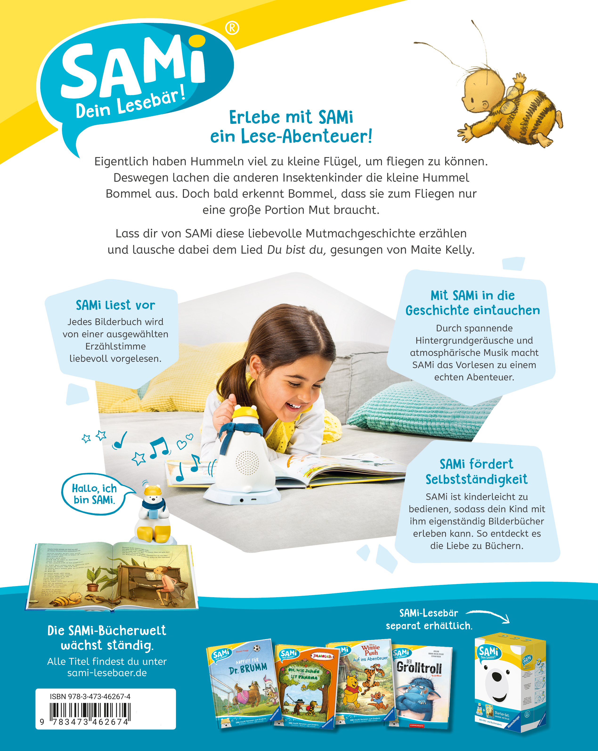 Mit SAMi - dein Lesebär tauchen Kinder ab 3 Jahren selbstständig in die Welt der Bilderbücher ein. Einfach ans Buch gesteckt, liest SAMi die Geschichte vor, während das Kind durch das Buch blättert. Dabei erkennt SAMi genau, auf welcher Seite sich das Kind befindet. Das Kind kann auf diese Weise frei im Buch vor- und zurückblättern und seine Lieblingsgeschichten beliebig oft anhören. So fördert SAMi die Selbstbeschäftigung und regt die Fantasie der Kinder an. SAMi kann verschiedene Bücher zu den unterschiedlichsten Themengebieten vorlesen: Neben wichtigen Themen aus dem Kinderalltag (z.B. Freundschaft, Streit), gibt es auch witzige Abenteuer und spannende Geschichten mit den Helden aus Filmen und Serien.