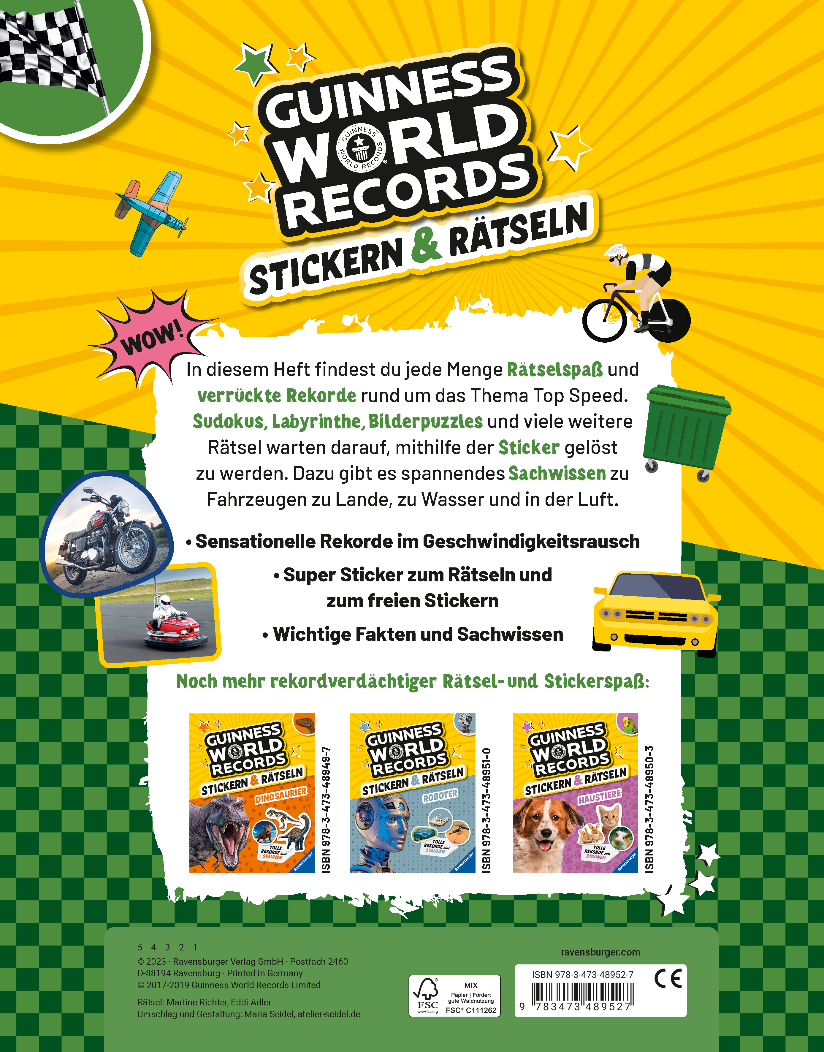 Wie schnell fährt das schnellste Auto aller Zeiten? Welches Tempo kann man mit einem Fahrrad erreichen? Und welches Flugzeug hält bislang den Geschwindigkeitsrekord? Dieses Rätsel- und Stickerheft widmet sich Rekorden rund um die Themen Fahrzeuge und Geschwindigkeit. Eine Vielzahl unterschiedlicher Rätselarten, teilweise mit Stickeraufgaben, sorgt für abwechslungsreiche und spannende Unterhaltung. Dazu gibt es Superlative und Höchstleistungen aus dem Guinness World Records Universum.